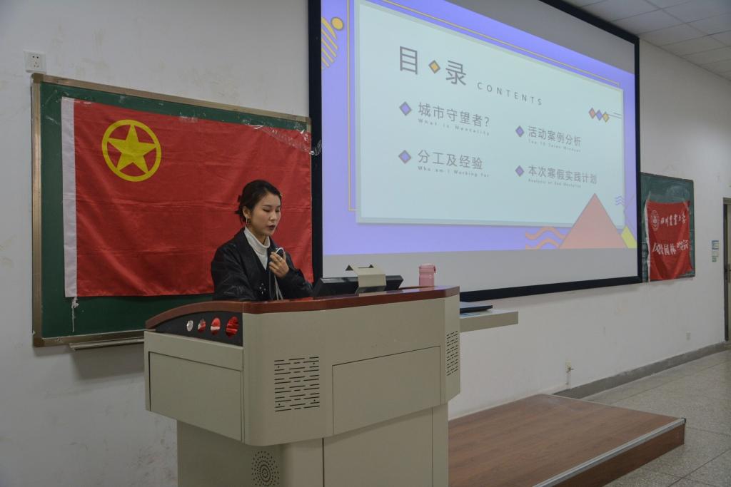 除此之外,还有来自城市守望者团队的负责人央卓同学和来自“一言一行”环保知识普及调研的负责人李琳同学作为校级优秀团队负责人为大家讲解她们进行社会实践的全过程。旨在让同学们更确切地学习如何做好社会实践,打造优秀实践团队。
