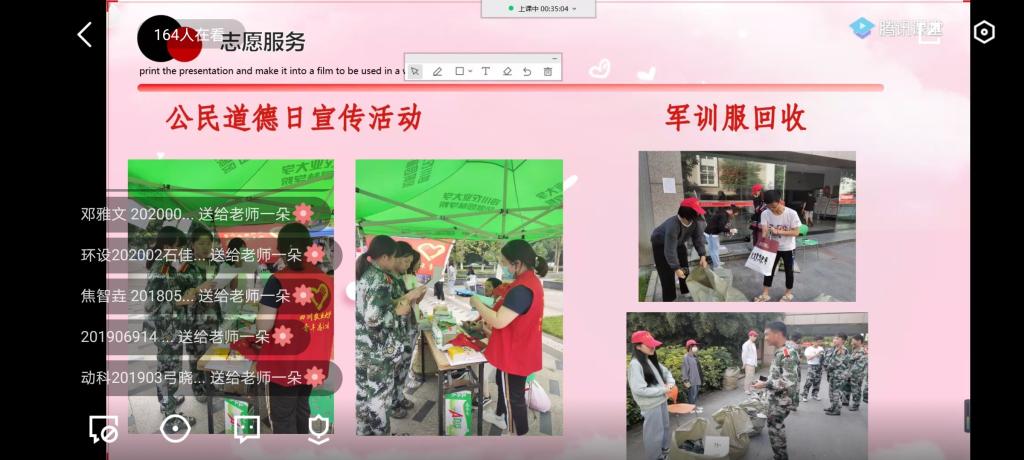 为向同学们宣传刚刚过去的国际志愿者日,风院青协志愿者通过线上的讲座向同学们普及有关志愿活动的相关内容。16日晚,来自成都校区各院系的同学们积极线上观看讲座,并在讲座结束后将心得分享至群中。每位参与者在这次活动后都有真挚的感想体会。一位参与者在自己的心得中说到:“这样一个小小的讲座,却让我看见一个庞大的社会缩影。志愿工作是项造福于社会的行为,山区支教的老师、景区服务站的义工、抗疫一线的逆行者…志愿者在人海前行,劳动的汗水是他们珍贵的硕果,我希望以后也能有机会成为他们的一份子,帮助他人,发挥自己的价值。”