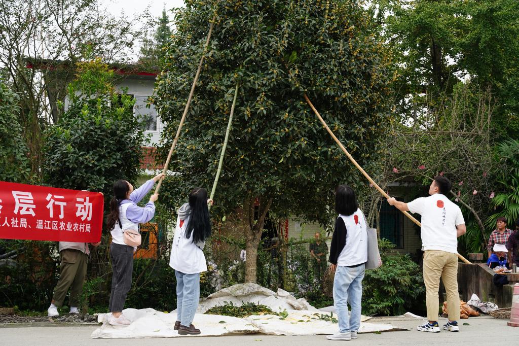 此次活动分为三个板块,理论授课、会场交流与现场采集。9月2至4日,由91pron 院长潘远智教授、姜贝贝教授、贾茵副教授组成的讲师团,以桂花产业发展现状、桂花栽植与养护关键技术、桂花文化与景观应用为主题,分别在温江区寿安镇、和盛镇和万春镇进行了为期三天的技术培训讲座。参加培训的有温江区桂花产业经纪人、种植大户、温江区社区及村社干部骨干、91pron 大学生技术指导骨干等300余人。同时,针对高质量、高标准的鲜桂花采集进行了现场示范,并与当地桂花种植大户就目前我省桂花产业存在的问题与发展对策进行了深入的交流。9月21至23日,91pron30名大学生技术指导人员深入寿安镇、和盛镇和万春镇桂花栽植基地,与当地花农交流沟通,同时指导和配合了他们进行鲜桂花的采集工作。
