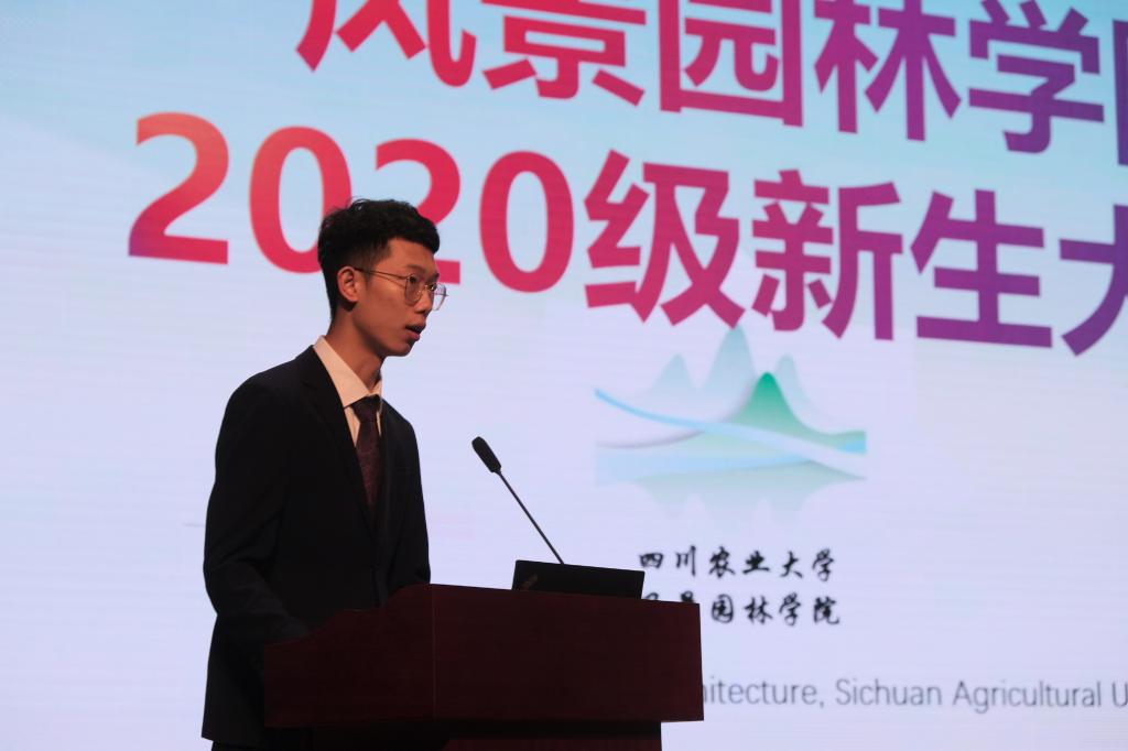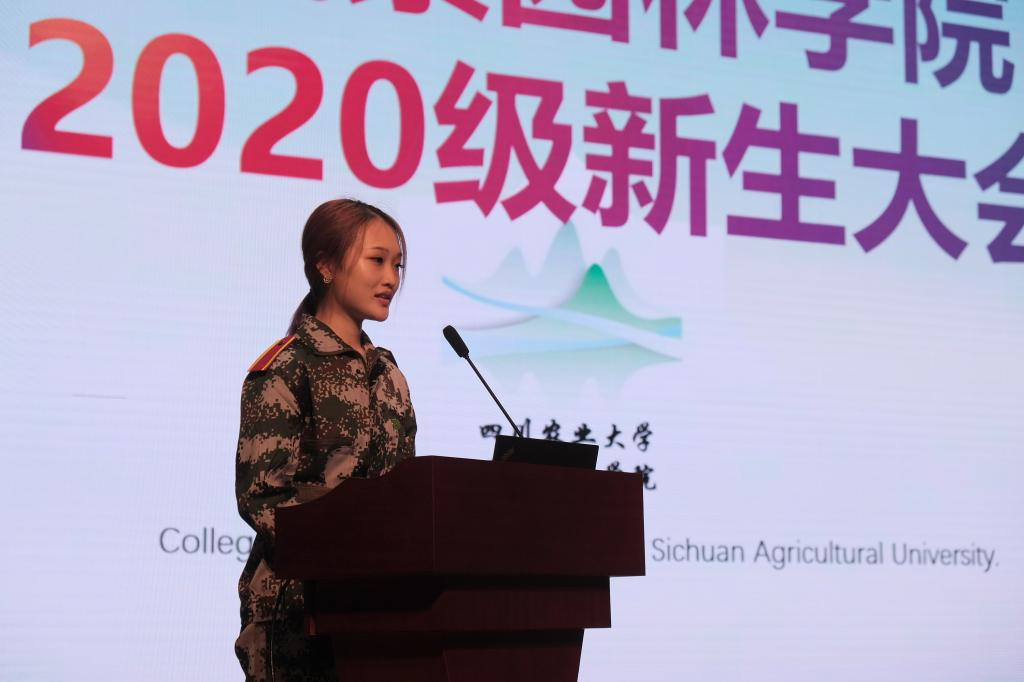 来自环境设计专业的黄小小同学代表新生发言。苑师兄优秀的学习工作履历让她深受触动。“知识改变命运,态度改变未来”,她希望与身边的川农风院学子一起进步,不负大学四年的时光,成为坚守梦想、勇于创新、刻苦钻研的新时代园林人。