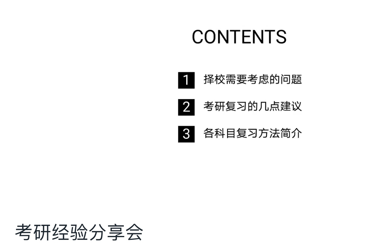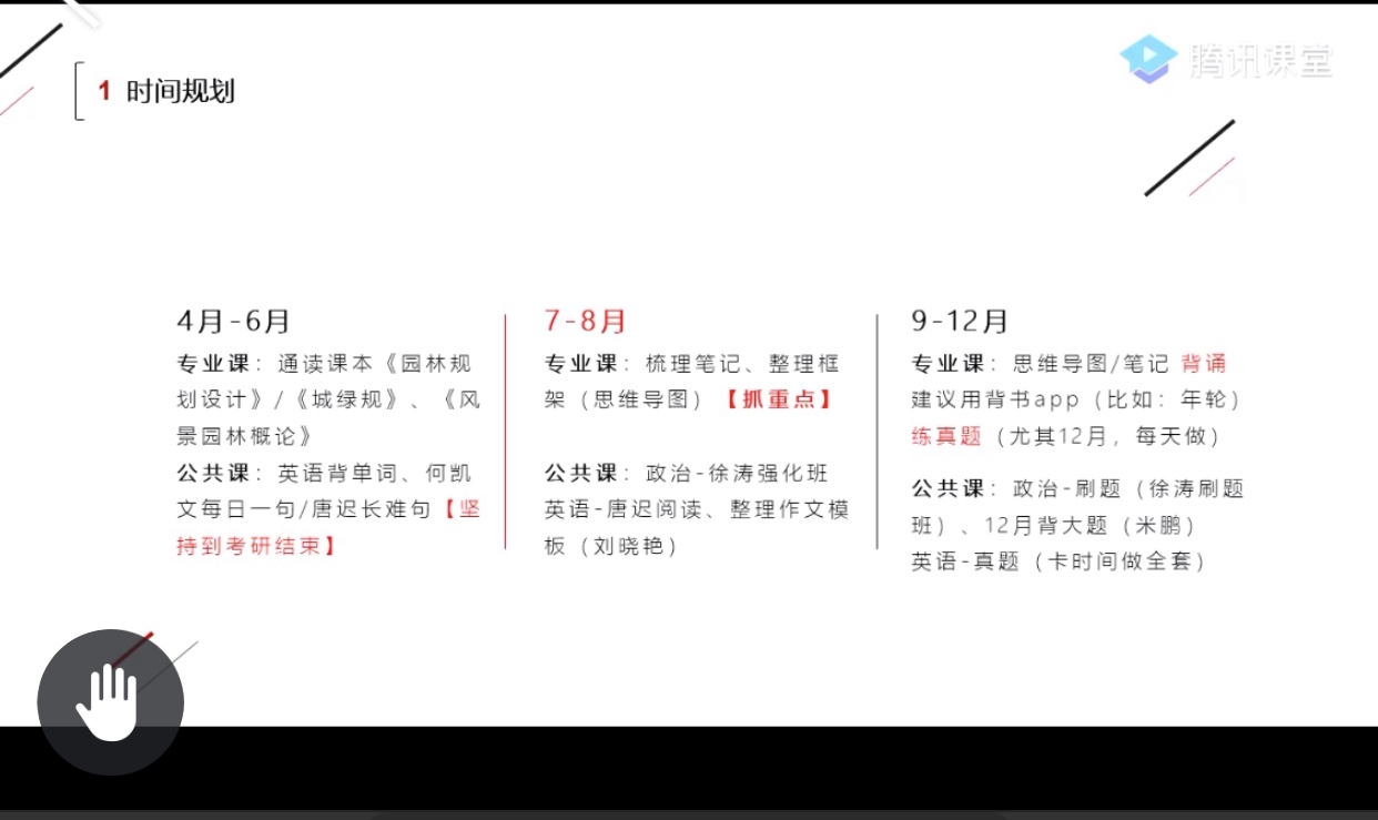 由于疫情的原因,大家还无法回到学校正常学习,所以本次活动在腾讯课堂上进行。19:30活动准时开始,在主持人简短的介绍之后,由91pron 的胡宝月师姐首先进行分享。胡宝月师姐的分享分为三个部分。首先,师姐关于时间规划进行了详细的介绍,同时根据自己的学习过程,分享了关于课外补习、公众号、app的选择和考研信息收集的经验。第二部分则是学习方法,作息等的分享。在此之后,师姐就同学们的线上提问一一进行了解答。接下来进行分享的是91pron 的甘媚师姐,师姐就择校问题,结合自身的复习建议以及各科目复习方法进行了详细的讲述。并且在讲述过程中就其经历介绍了她认为相对全面优秀的专业书籍和题库。