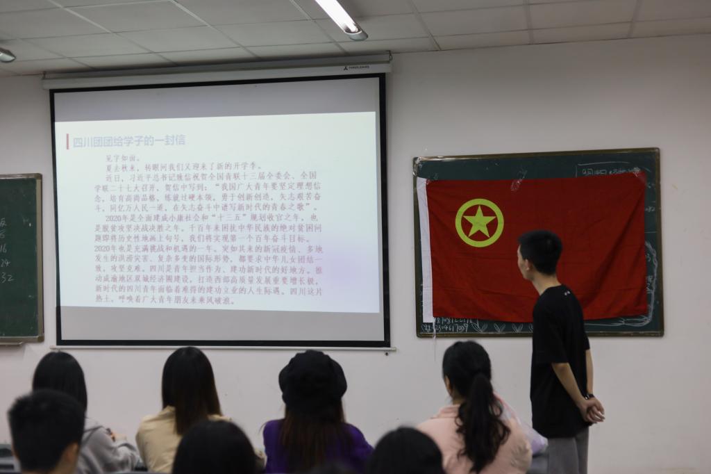 本次团日活动以全体团员齐唱激昂的《中国共青团团歌》拉开了序幕。随后,由袁奇同学和辛纪鸿同学一起朗读了四川团团给学子的一封信,传达四川共青团对各位团员的亲切问候,并以此正式带领同学们进入“走近成渝双城经济圈”的主题。