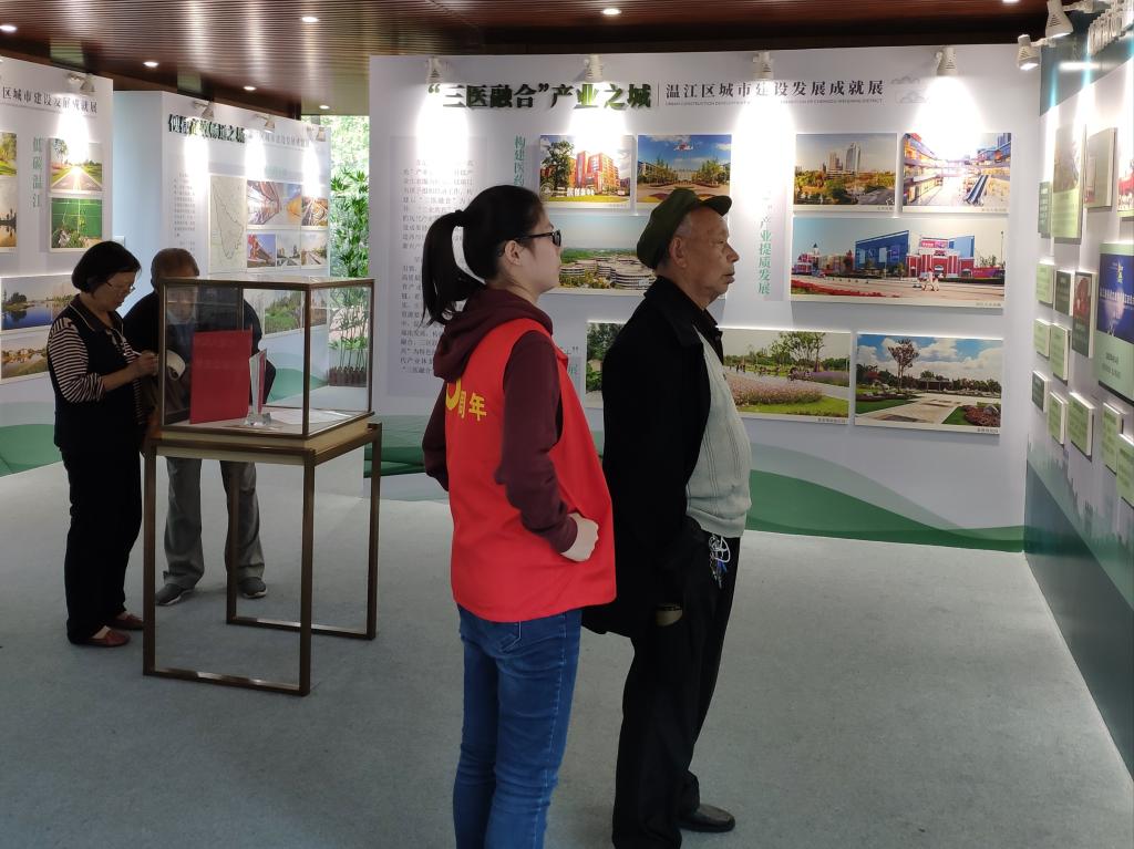志愿分队布置展览会场,引导游客入馆参观,维护会场秩序。本次活动旨在向市民介绍城市规划建设发展的成就,让市民知晓城市规划,架起市政府与市民间的沟通桥梁。参展作品以普通人的视角,用真实、生动的影像,记录温江70年时代变迁。这些纪实照片,带着历史记忆,从不同侧面反映了温江70年特别是改革开放新时代的创新发展与巨大变化,展现不同时代温江人的生活万象。