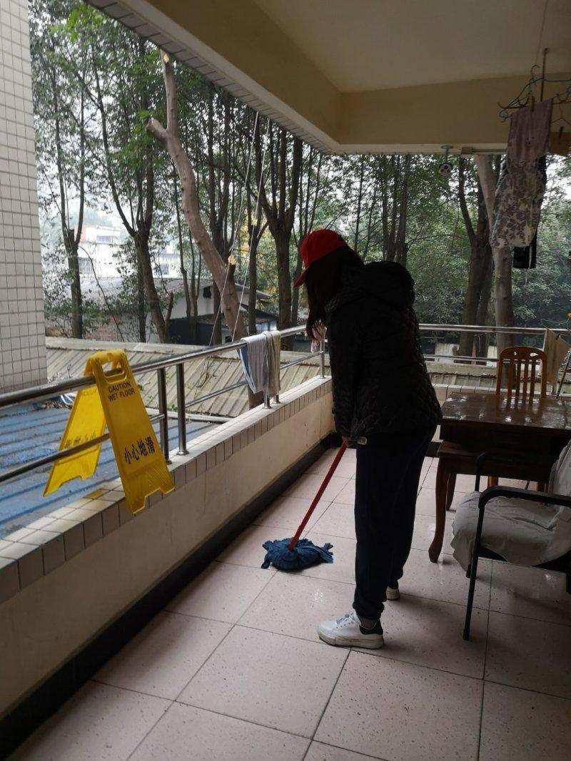 到达公寓后,志愿者们开始分工,有的负责打扫房间,有的负责拖地,有的负责擦栏杆,随着水哗哗的流出声,志愿者门已经开始行动了,拖着超大的拖把来回跑动,一来一回,地面便已整洁明亮,一楼,二楼,三楼,旁边擦栏杆的就要细致多了,弯腰起身,一点一点推进,每一个缝隙都要认真擦过,有时爷爷奶奶还会与我们聊天,听他们把故事娓娓道来,即便拖了进度,也是不在乎的,爷爷奶奶可以讲很多,我们便安静聆听。