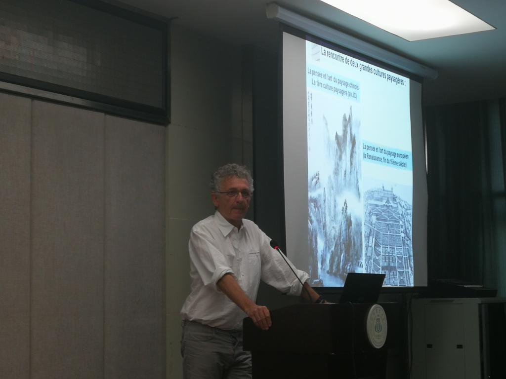 Bernard Brunet先生结合实践经验和研究成果,理论联系实际,为在场师生分享了以景观思维如何在欧洲发展以及景观如何囊括了生态学、美学等专业为主要内容的学术报告;首先论述了中国与欧洲景观思维的差异性以及相互融合的同一性,接着解释了景观学的定义及学科范围,从欧洲历史概述景观学的发展历程(巴比伦空中花园到景观融入城市规划),介绍了不同的景观设计学派。重点提出,设计应遵循“生态学”各项原则,用生态学原理说服政治家、建筑设计师等的必要性。其次,与Laurent Guoyou Beauchamps先生对与我校合作的CIEPT课程从课程安排到计划为91pron师生进行详尽解说。报告完毕后,本院师生与教授进行了交流互动,报告在全体师生的热烈掌声中落下帷幕。