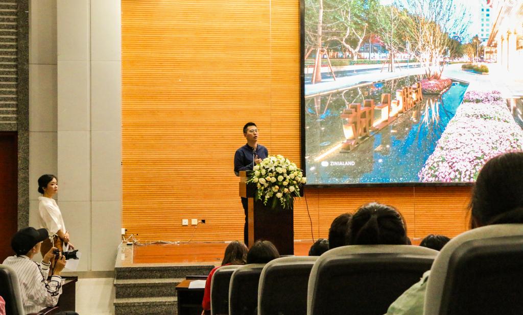 “设计——为了更美好的世界”,成都致澜景观设计有限公司创始合伙人李亮先生则从该公司的经营理念入手,介绍了其公司的工作模式、发展方向等方面。他提出,“公共景观联系”是做景观时的一个重要考虑因素,使景观与建筑一体化,重在通过景观联系道路、商业和人的日常活动,提醒同学们应当注重自己的创造力和发展途径,要在自然生长中寻找启发,多学习“跨界知识”,实现自我价值,成为综合性人才。