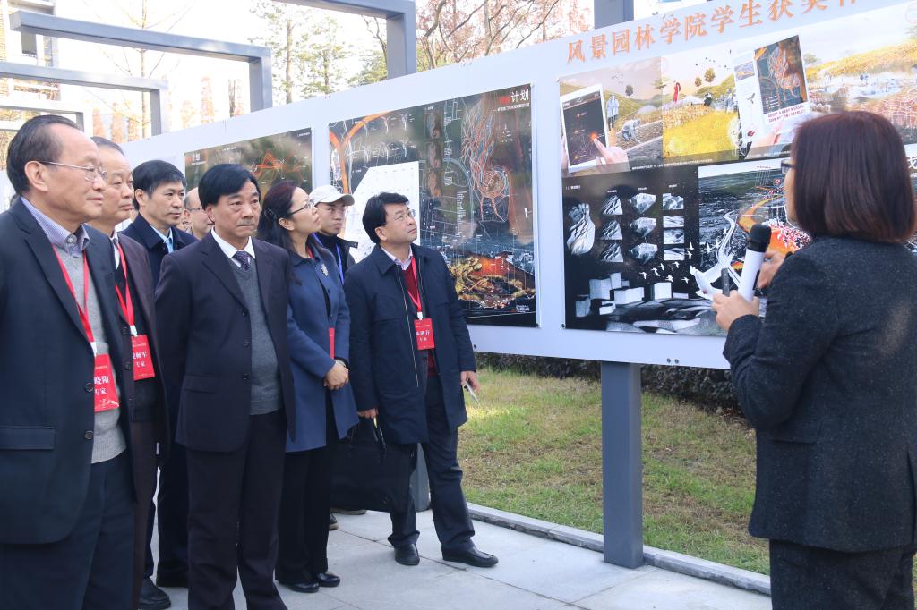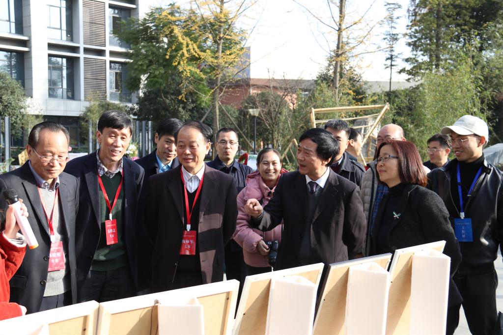 首先映入专家眼帘的是由学生设计的“西蜀秀竹”的三组作品,由参与设计的学生之一罗文皓为专家组介绍了作品理念。“西蜀秀竹”的3组作品,从“设计构思——模型制作——建造成物”均由我们的学生完成,每一个作品将西蜀园林中的竹挺直、柔韧、中空、成节的特性与现代构型艺术有机地融合起来,展现出3个不同的主题意境“竹秩序、万物生长、竹林深处有人家”。作品只使用竹材料,纵横交错的竹结构也彰显出深深竹林的意境;“深处”代表着竹神,表现竹工艺的传承与创新;“人家”体现了竹魂,融入了川农大精神,以及我们风院人坚韧的精神。