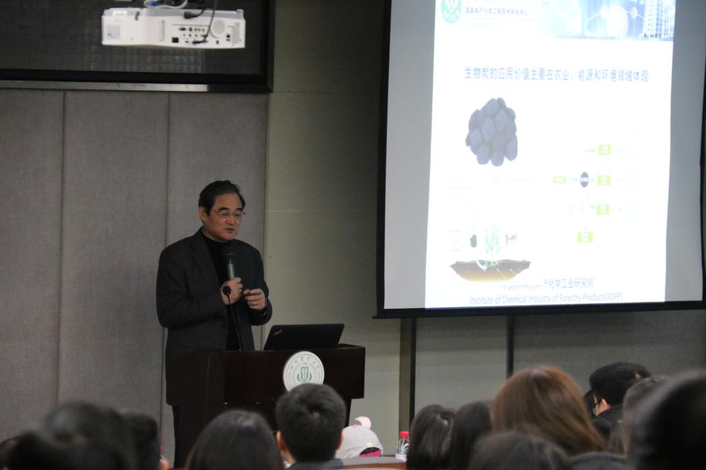 蒋剑锋院士报告题目为《林业生物质资源化学利用技术的研究与发展》,详细介绍了应用物理、生物、化学等方法,将木质资源和非木质资源目标产物定向利用,生产取之不竭的可再生资源的相关前沿研究进展,向广大师生展示了一副能源革命的宏伟蓝图。