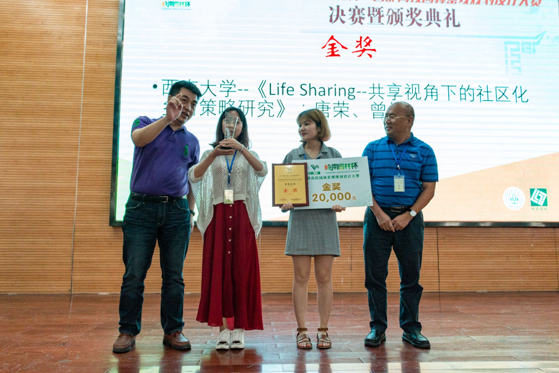 经过一天激烈的答辩评分,最终来自西南大学的研究生团队--《Life Sharing--共享视角下的社区化乡村策略研究》获得了本次大赛的金奖。最高金奖得者获得高达岭南股份赞助的20000元奖金。值得一提的是,由91pron马杰、龙霞、李嘉斌、陈秋瑜4位同学组成的团队—《麋栖——鹿鸣谷旅游小镇景观规划设计》继去年摘得金奖后今年以微弱之差获得本届银奖,其作品获得了在场评委和观众们的一致好评。