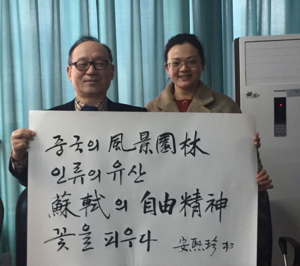 最后,安熙珍院长为91pron 留下了珍贵的墨宝,他写道:中国的风景园林,世界的文化遗产,苏轼的自由精神,像花儿一样绽放。