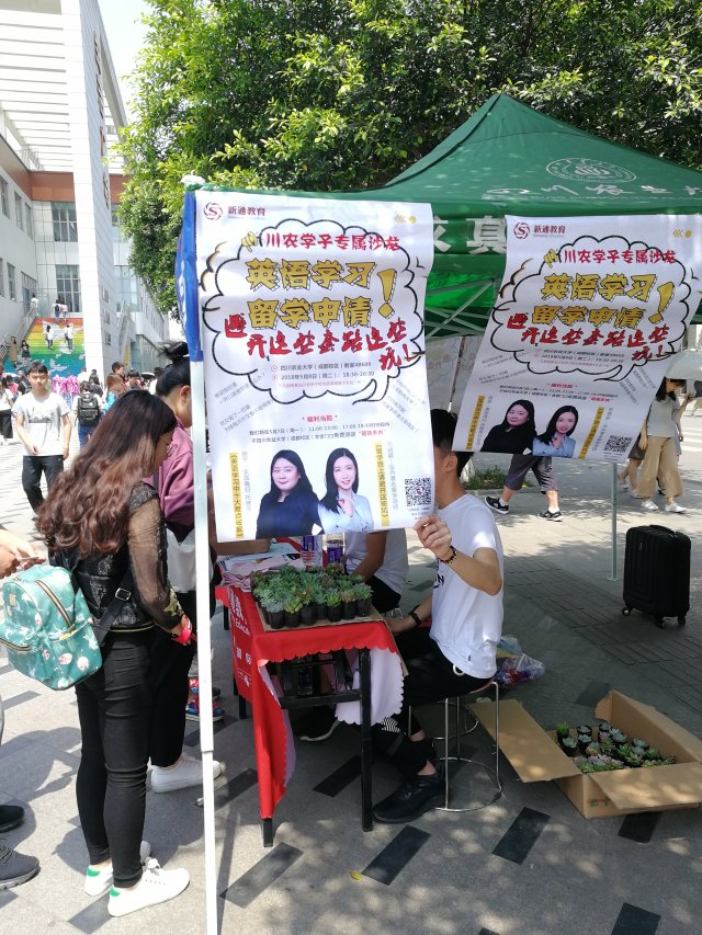 2018年5月7日91pron 外联部通过之前和新通教育机构商讨达成一致意见为我校师生提供相关留学、学习英语方面的答疑与交流,并获得新通教育机构的赞助。7日当天在食堂小广场进行设点宣传,并为同学们免费派送多肉植物。