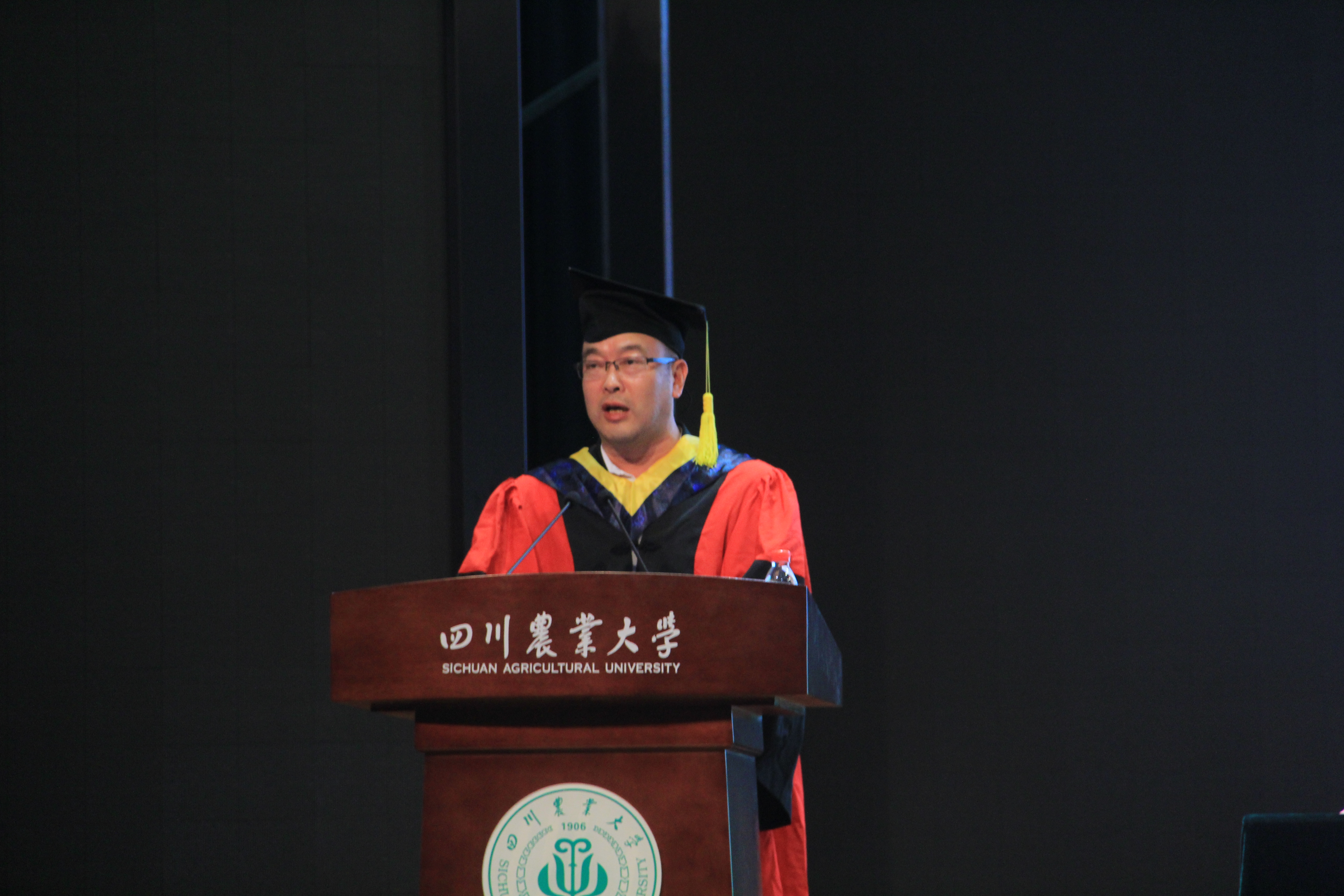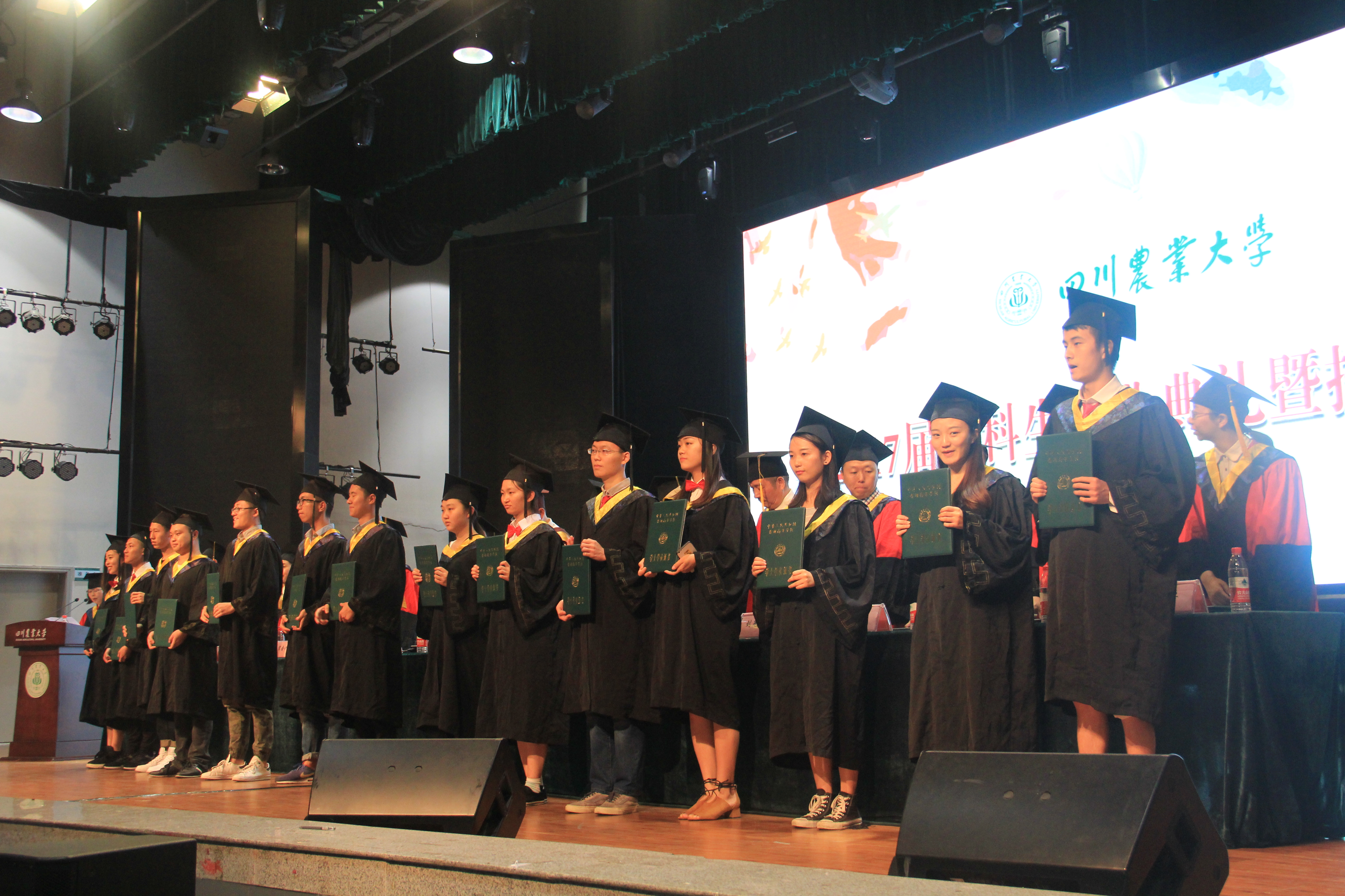 91pron 副院长潘远智教授宣读优秀毕业论文、优秀大学毕业生表彰决定及表彰名单,其中8人获得“四川省优秀大学生”、39人获得 “校级优秀大学生” 荣誉称号,黄楚梨等五人获得优秀学士学位论文(设计)奖励并接受91pron 老师颁奖。