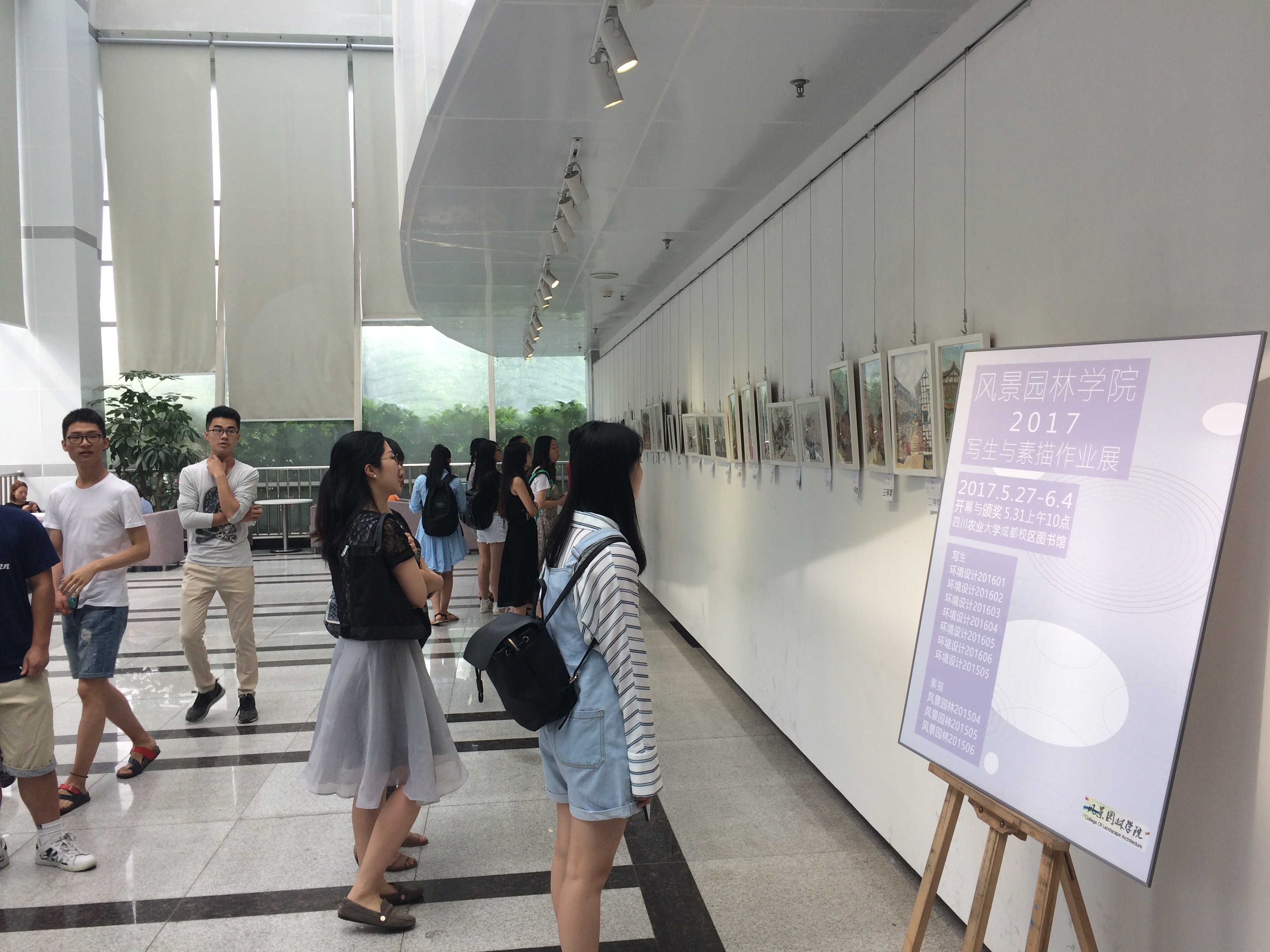 风景园林专业同学通过近半学期的精细素描刻画与环境设计专业同学为期一周的平乐古镇写生,同学们用自己手中的画笔定格了美丽的画面,用心凝聚的作品,绘成独特的美丽画面,汇聚在图书馆中给前来参观的同学和老师们带来了一场盛大的视觉体验。