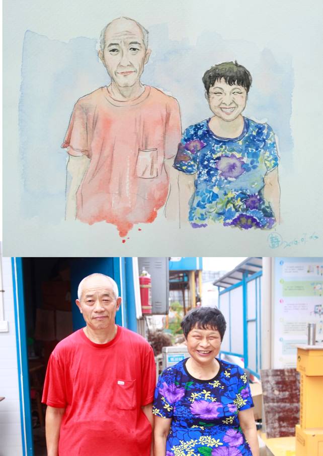 与工地负责人协调好时间后,团队于2016年7月14带着画好的画像再次来到工地。远远的,团队的同学们就看见坐在工地外的树下乘凉的李延华夫妇。阿姨还是穿着第一次见面时的那件蓝紫色带着花的短袖,她坐在树下的木椅子上,手拿着一把扇子在扇风。看到熟悉的身影,阿姨朝同学们笑了笑。当她拿到画像的时候,笑得特别开心,使劲夸同学们画得好、懂事。一边说着,还一边把手里的扇子递给同学们,让大家扇风。树下,满是凉意。