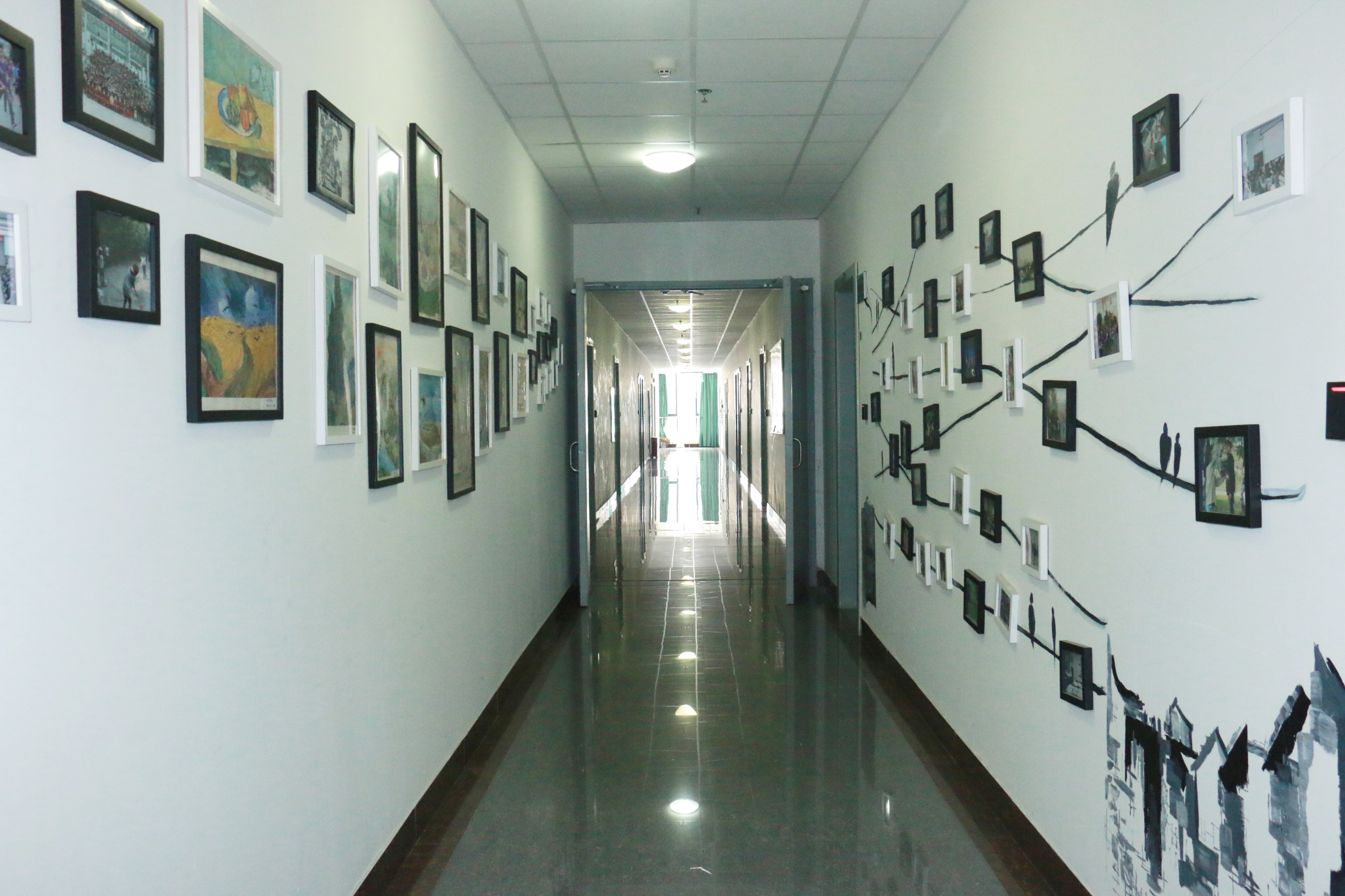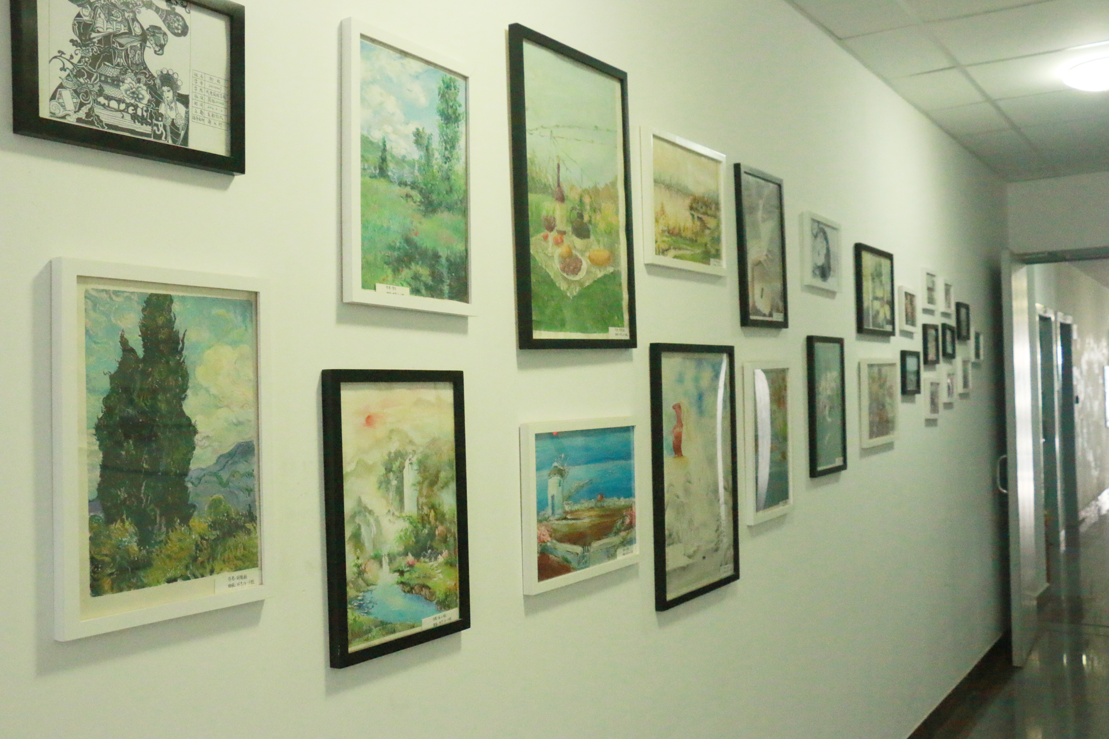 一走进成都校区五教三楼91pron 老师办公的地方,首先映入眼帘的便是右边墙上的照片墙,照片记录的是91pron 学子学习生活的点点滴滴,与黑色的线条搭配在白色的墙体上,让人在感受学生丰富的课余生活的同时,也能体味到蕴于他们心中的那抹淡雅。“静若处子,动如脱兔”,这样动静相宜的理念,培养出了一批又一批优秀的学生。墙面左侧的作品集构图巧妙,各式各样的水粉画、装饰图案,充分表现了91pron 学子为之骄傲的才能,艺术气息扑面而来,仿佛来到了艺术长廊。