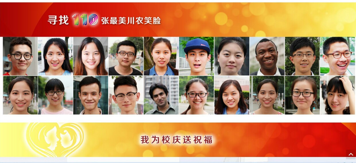 将迎来110周年校庆,百载年岁,在这块饱含辛勤耕耘的土地,我们用微笑面对挫折,进而越战越勇,我们用微笑喜迎荣耀,脚踏实地更进层楼。川农人,用微笑面对人生百态,用微笑谱写百载华章,川农人的笑脸,记录我们的过往,承载着我们对母校的深情,我们,用笑脸回眸110周年,我们用笑脸迎接下一个百年。