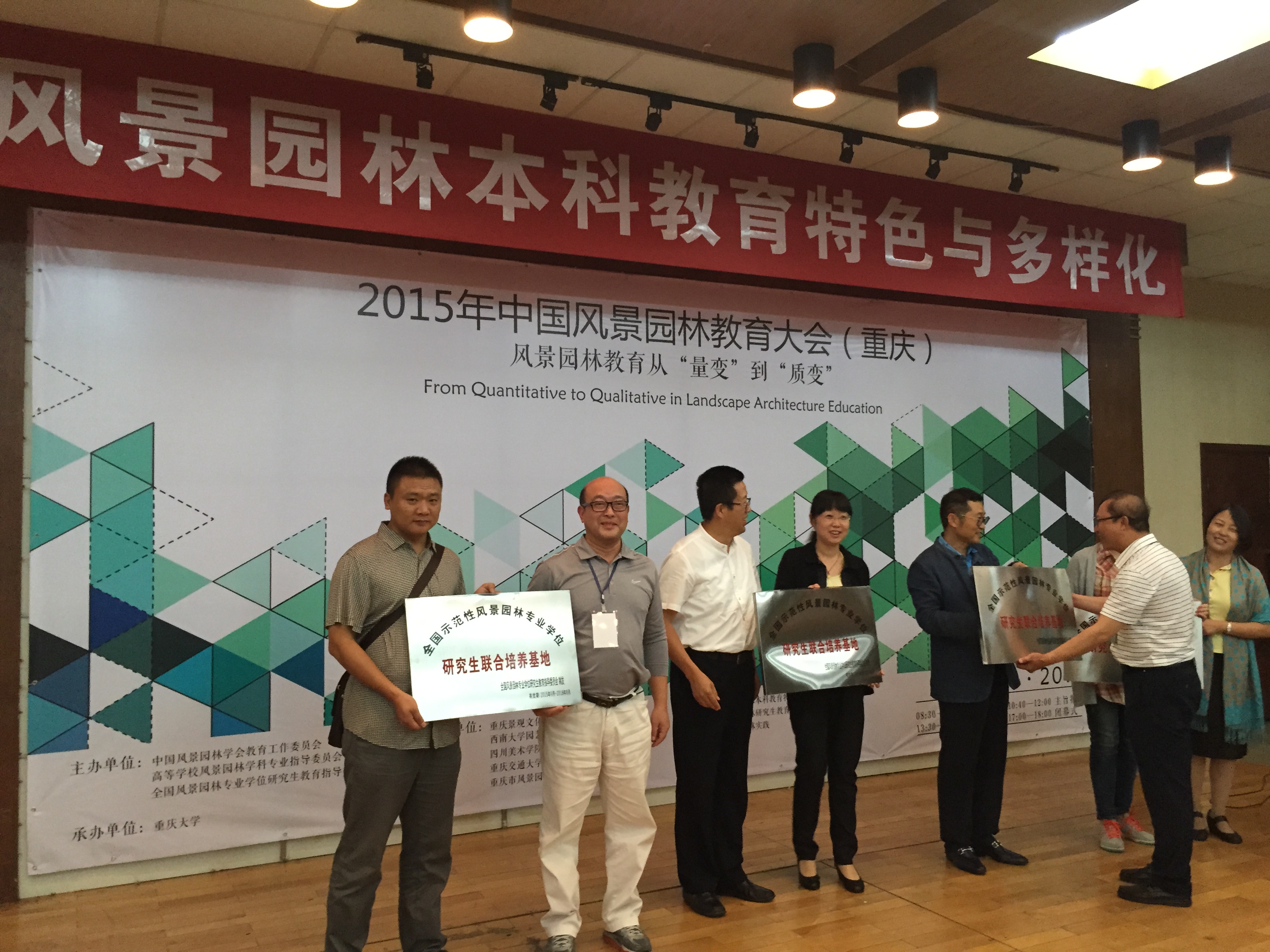 9月18日,在重庆大学举行的全国风景园林教育大会上,全国风景园林专业学位教育指导委员会向获得“全国示范性风景园林专业学位”研究生联合培养基地的单位进行了授牌仪式。由91pron 和四川农大风景园林设计研究有限责任公司共同申报的研究生联合培养基地获此殊荣,全国共有10所院校成功申报。