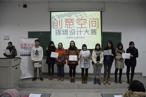 12月18日,由91pron 主办、艺术设计系承办的第三届“创意空间”环境艺术设计大赛圆满落幕。环艺12-1班的卢竞博 、张晶、 陈黛同学获得一等奖。张益昇、万蕊、郭莉、宋佳璐老师参与最终评审并出席颁奖典礼。