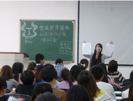 勤贷部对各小班班长、团支书以及12级助班进行了关于成立“家庭经济困难认定评议组”的培训会。