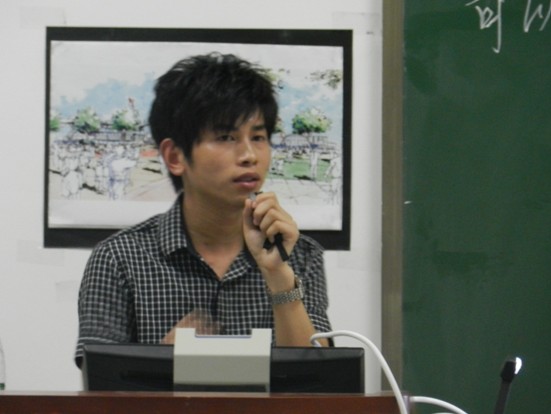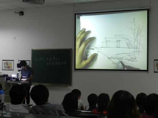 邓蒲兵设计师结合自身经历与同学们分享了他的人生信条和成功法则,介绍了练好手绘草图的方法,强调了手绘设计应在快速中表现出透视的重要性。邓蒲兵现场手绘演示更是将此次讲座带到高潮,最为精彩的是邓老师快速地绘出一幅精美的手绘作品并且在绘制过程中回答了同学的提问。讲座现场气氛活跃,惊呼声此起彼伏。