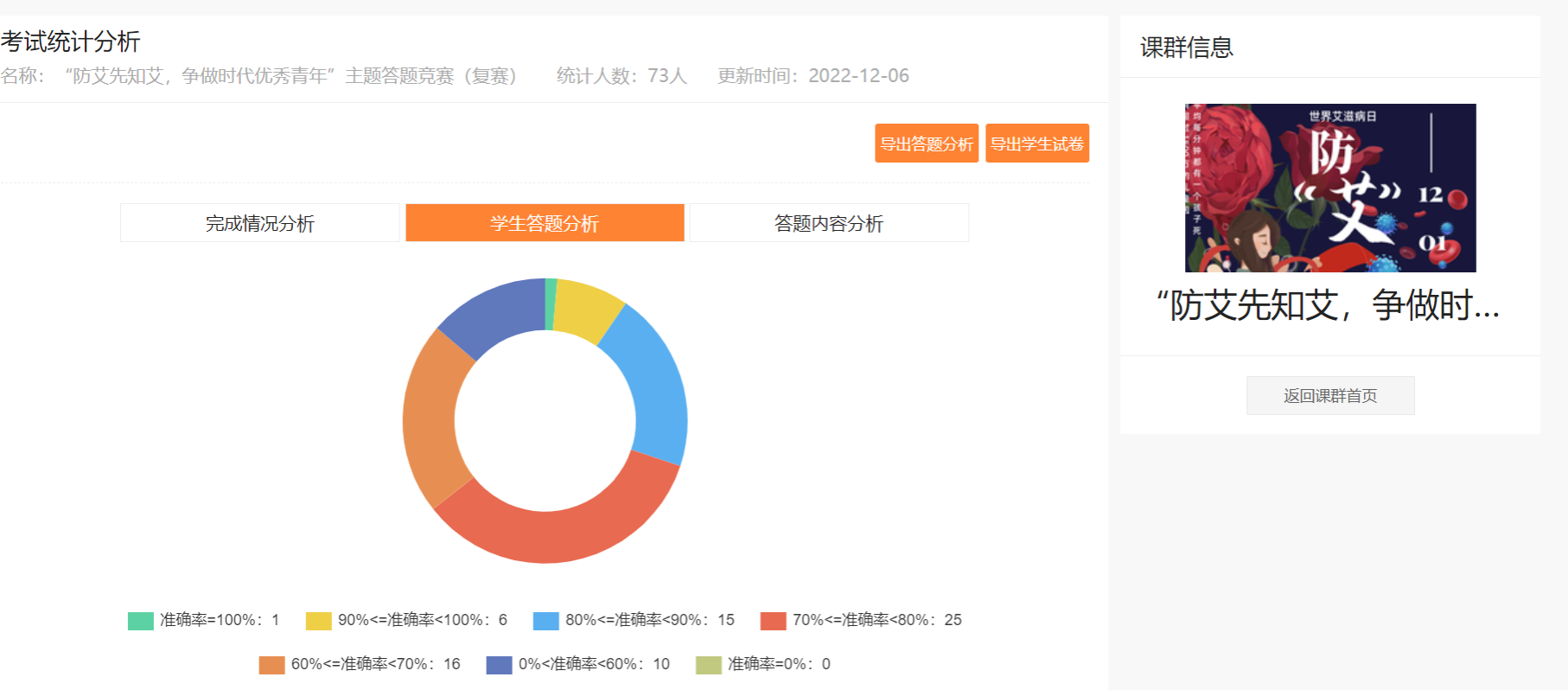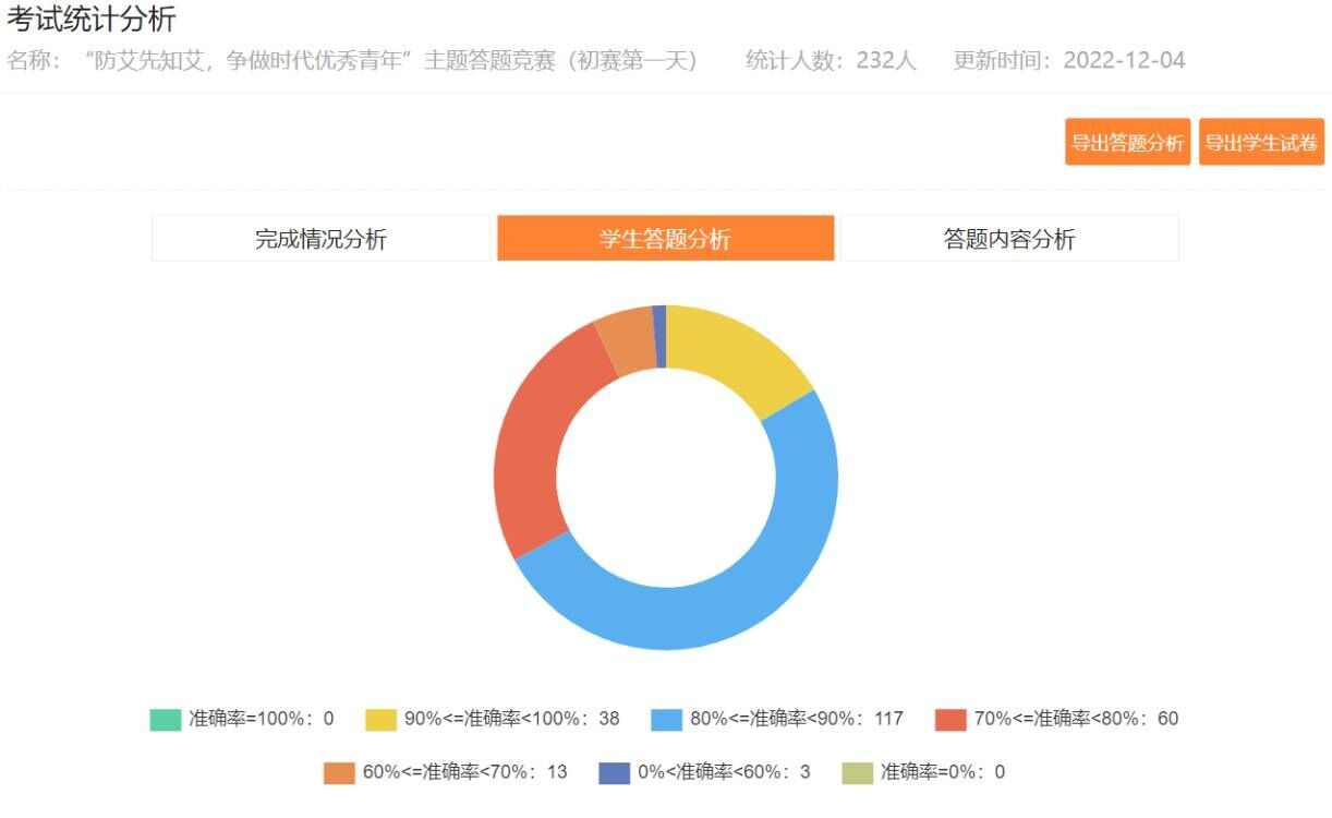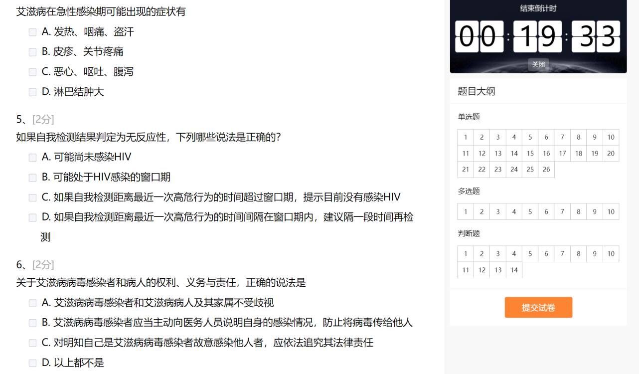 在疫情防控的形势下,本次活动采用线上题库学习答题的方式进行。两91pron 组织者将题目分为单选题、多选题、是非题判断,其考察形式多样、检验方式灵活,有效检测了参赛者在学习艾滋病相关知识的过程中对知识的掌握情况。活动分为初赛、复赛两个阶段,参赛者以个人形式参加,在规定时间内完成答题。11月29日上午,活动报名正式开启,上千余名学生通过i川农、咨询群等多种渠道了解信息前来报名。参赛者通过学习主办方准备的知识题库以及自主学习了解,为比赛做好了充分的准备。初赛阶段,参赛者需要在20分钟内完成50道题目,在此要求上绝大部分同学成绩良好,表现出对此次答题比赛的重复准备和高度重视。最终成绩优秀的前20%参赛者进入复赛阶段。复赛作答时间更短,覆盖知识面更广、题目难度更高,对于参赛者而言是更大的考验。在紧张激烈的答题环境下,比赛最终决出了一等奖1名、二等奖2名、三等奖3名。