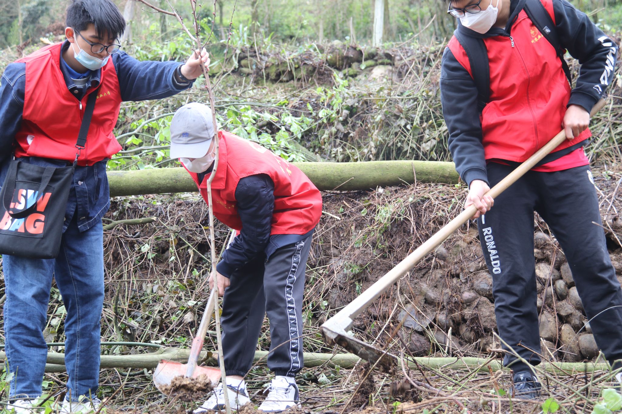 当天正值第45个植树节,义务植树也是联建活动的内容之一。在活动前的培训中,当同学们得知活动场地本身就是农户的经济林地,种的本身也是农户将用于生产苗木时,格外的认真冲散了第一次植树的紧张和兴奋。他们仔细听要领,学细节,有些工具是自己第一次使用,就拿着工具在空地上模拟动作。同学们清楚,这已经不是一次单纯的体验和学习,因为他们即将种下去的树苗,能不能种活、能不能长好将直接影响农户之后的收入。实际活动开始后,风院师生两两一组、相互配合,在社区党员同志和农户的帮助和指导下,300株桃树新苗慢慢在林地里挺立起来,同学们也纷纷举起手机和自己的义务成果合影纪念,互相交流植树的喜悦。