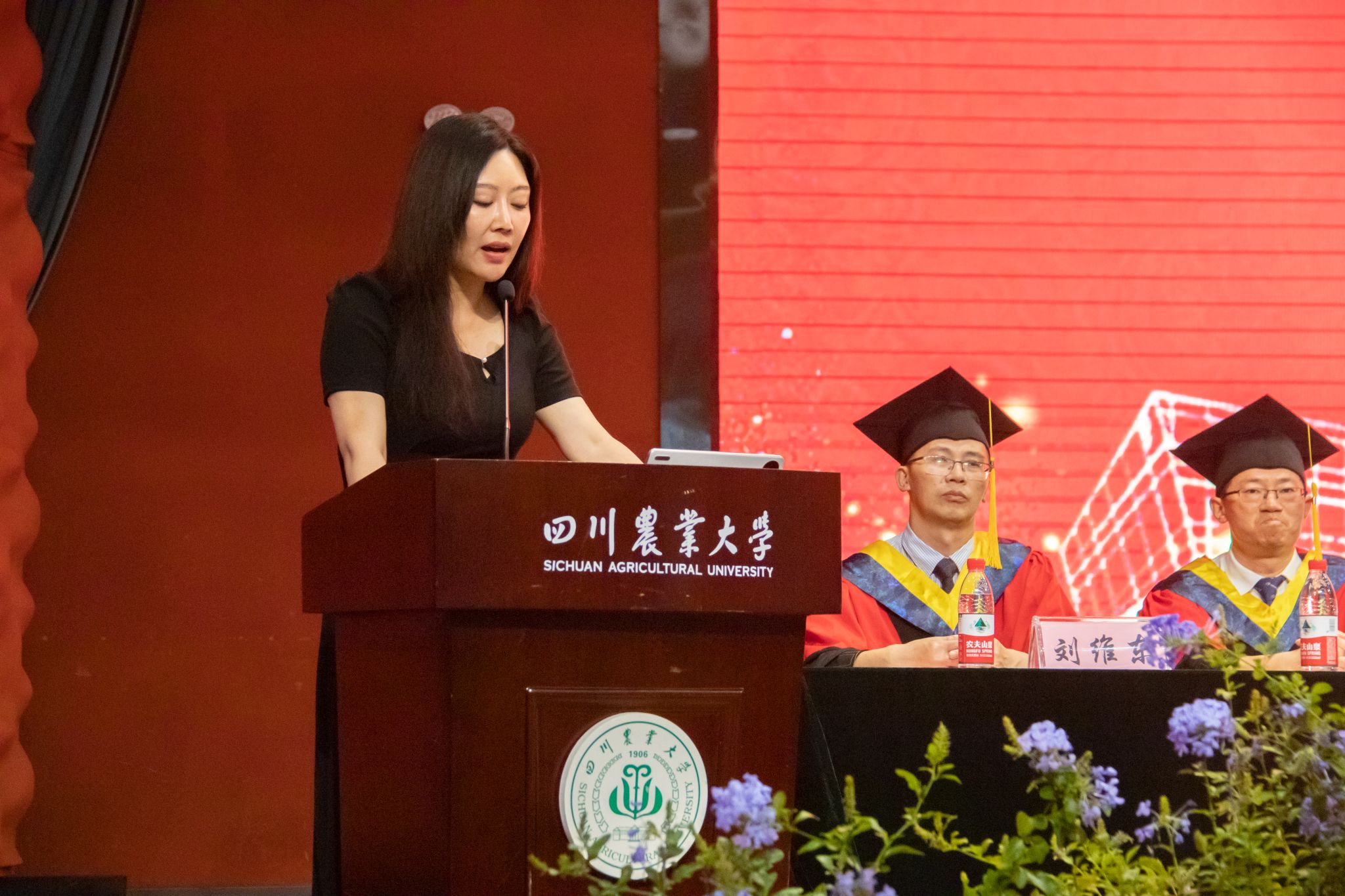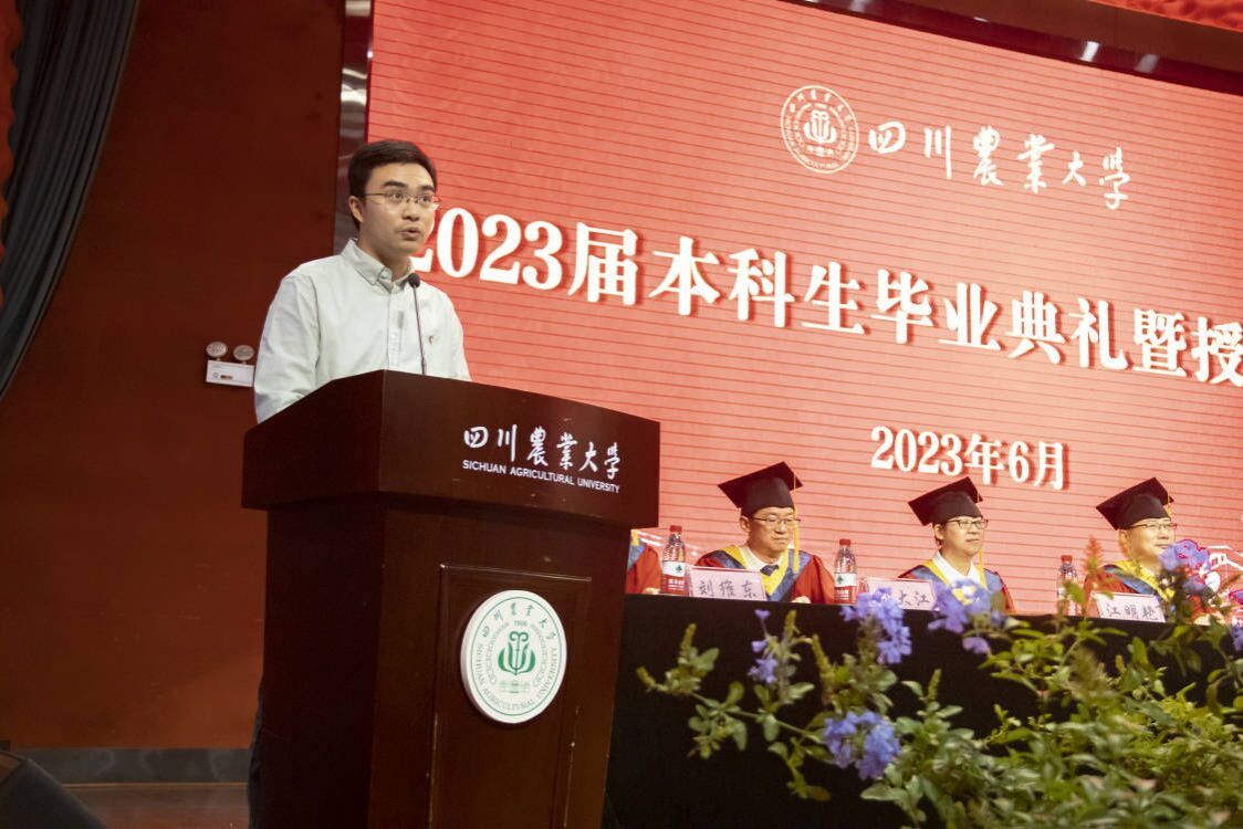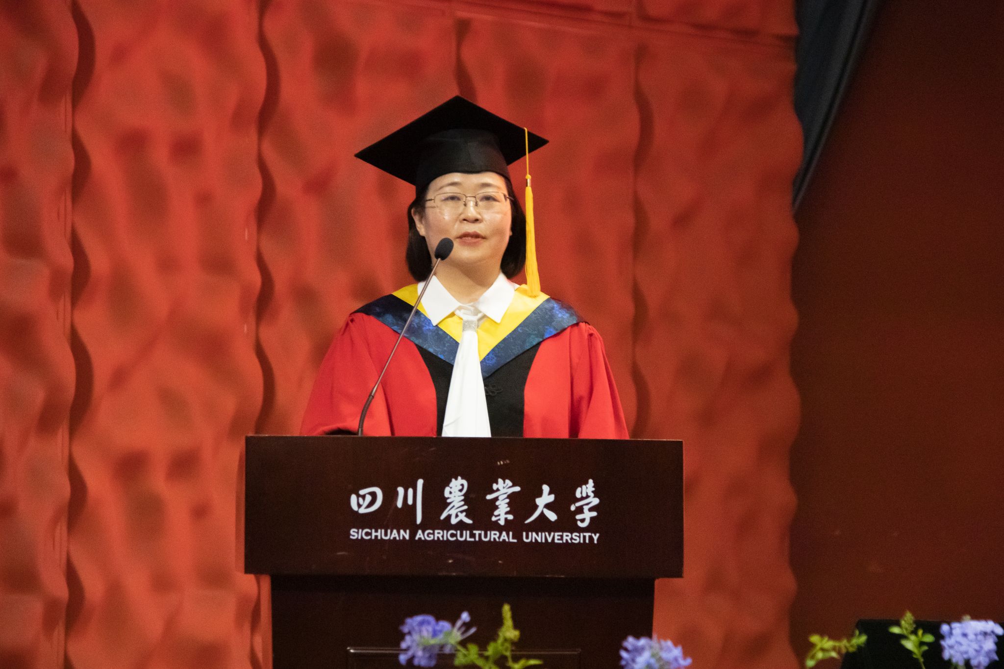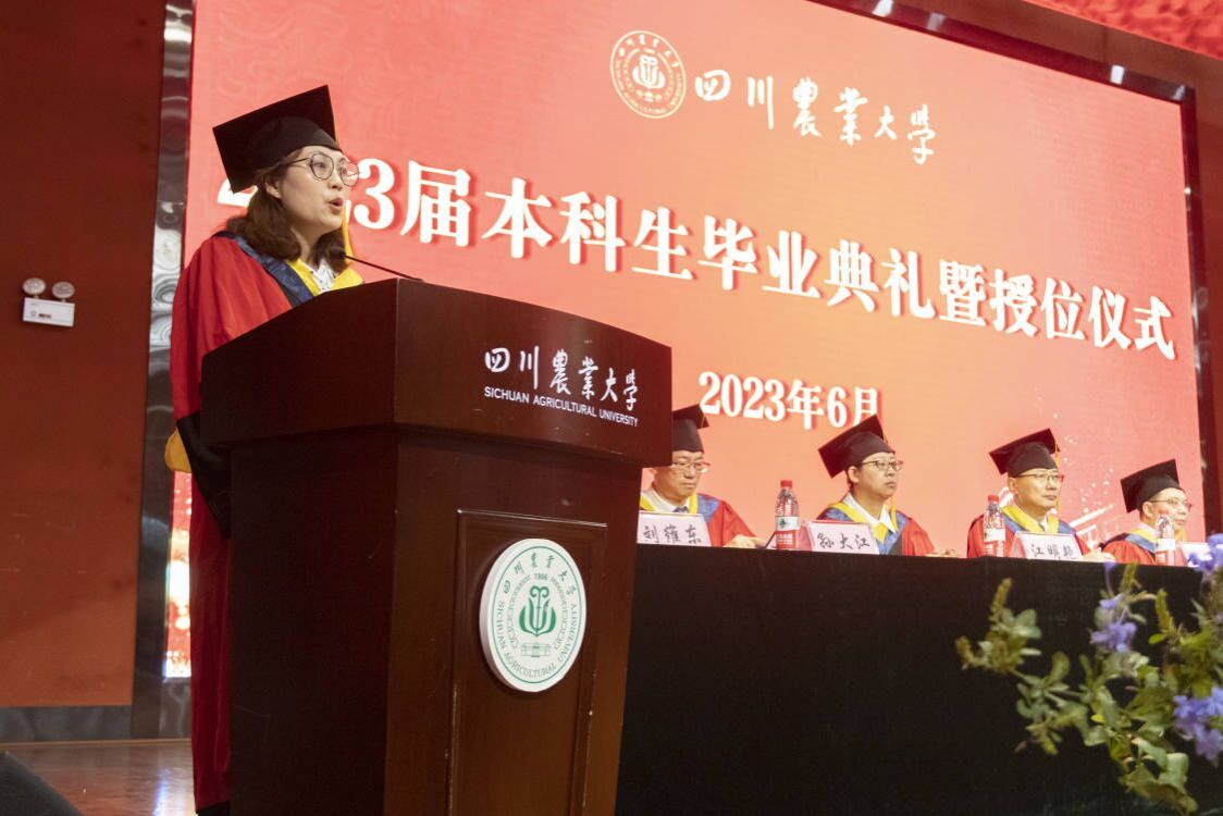 李西首先代表91pron 向2023届全体毕业学子表示热烈祝贺,肯定了同学们在大学期间取得的优异成绩,以及经过大学磨砺和奋进所展现出的责任与担当,欣喜同学们收获的团结力量和真挚的师生情谊。李西统括新时代要求和背景,寄语毕业生要放大格局,相互成就;践行仁者不忧、勇者不惧;领悟变则通,通则达,达则成。她谆谆叮咛毕业生们:“从今天起,大家就从川农学子成为年轻的川农校友,无论身在何处,91pron 永远是你们的坚强后盾,91pron 的大门永远向你们敞开,欢迎常回家看看!”