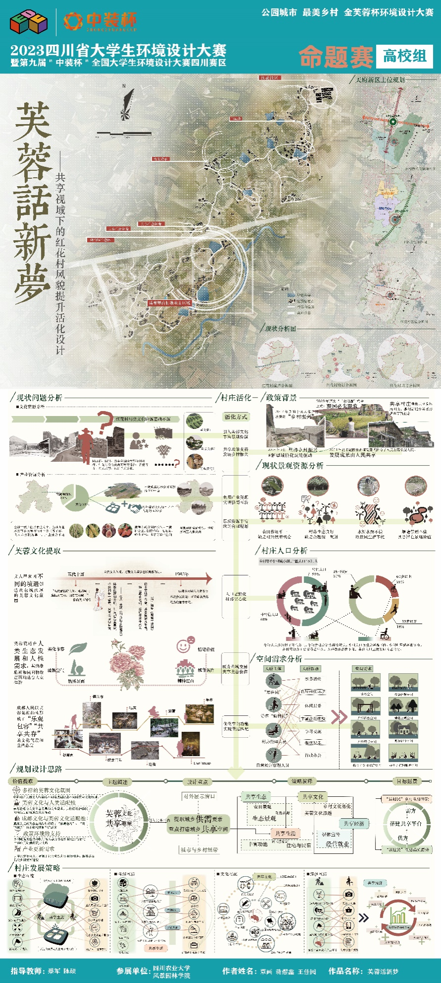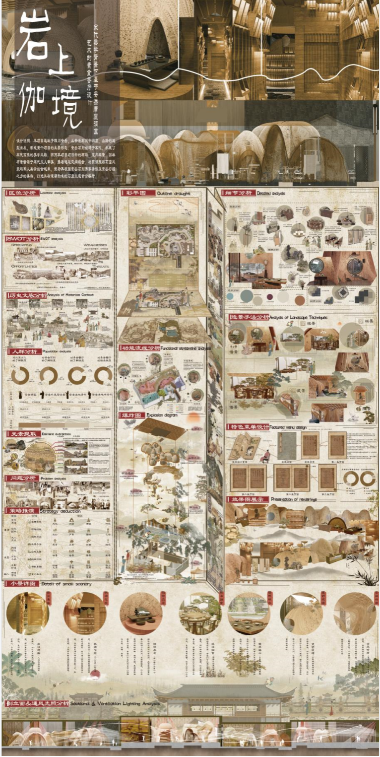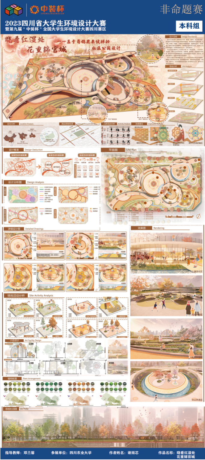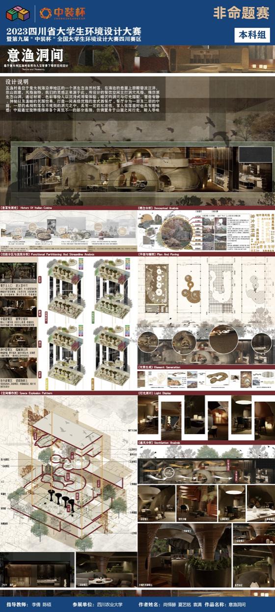 经过3个多月的比拼,我校91pron 《晓看红湿处,花重锦官城——基于蜀锦花类纹样的社区公园设计》《峰旅物语—基于品牌塑造和旅人视角下的乡镇旅游农庄打造》《意渔洞间》《岩上伽境——宋代美学背景下基于安岳摩崖洞窟艺术的素食餐厅设计》等4件作品获自选题赛道本科组一等奖,《宇宙探索--高压城市下的科普体验公园设计》等7件作品获二等奖,《森活——基于绿色生物材料运用下的现代办公设计》等8件作品获三等奖;分别有蔡军、陈硕,宋佳璐、何娟老师指导的《芙蓉话新梦——共享视域下的红花村风貌提升活化设计》和《老街新象,繁蓉太平》作品获“公园城市最美乡村”命题组赛道一等奖。蔡军、陈硕、邓兰馨、何娟、李倩、宋佳璐等6位老师获评“优秀指导老师”。