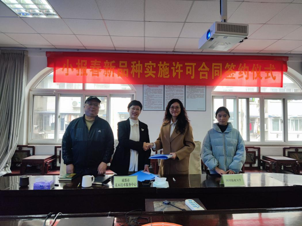 11月24日,91pron 贾茵副教授与成都市公园城市管理局成都市花木技术服务中心主任张彤就3个小报春新品种实施许可正式签约,实现了91pron 首例花卉品种实施权的成功转让。