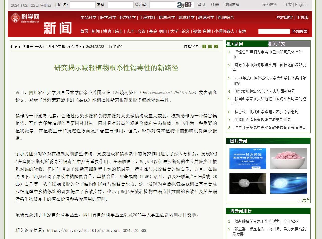 余小芳团队在《环境污染》(Environmental Pollution)发表研究论文,揭示了外源茉莉酸甲酯(MeJA)能调控波斯菊根部果胶多糖减轻镉毒性。