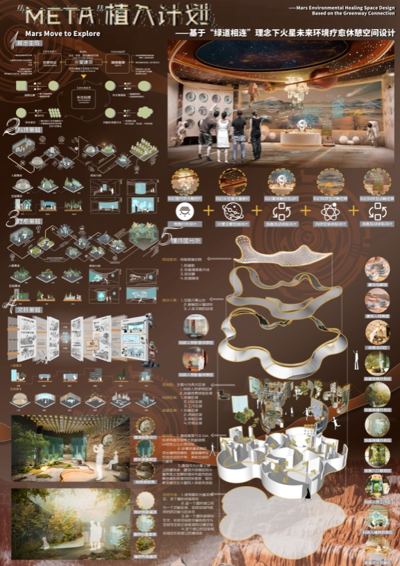 本次大赛自3月中旬启动,历时近三个月,共有100余名艺术类专业学生报名参赛。大赛提供多个的公共空间自由选择,自主设定空间性质,内容涉及火星移民、有机餐厅、意境茶室等空间,重点考察学生的设计知识和技巧应用、团队协作沟通能力以及创新创造思维等。经过初赛的遴选,最终共有10组作品成功进入当天的决赛。