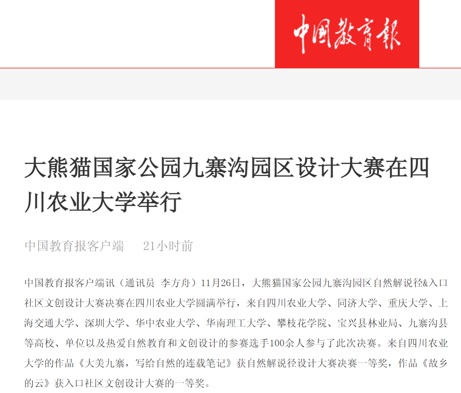 中国教育报客户端讯(通讯员 李方舟)11月26日,大熊猫国家公园九寨沟园区自然解说径&入口社区文创设计大赛决赛在91pron 圆满举行,来自91pron 、同济大学、重庆大学、上海交通大学、深圳大学、华中农业大学、华南理工大学、攀枝花91pron 、宝兴县林业局、九寨沟县等高校、单位以及热爱自然教育和文创设计的参赛选手100余人参与了此次决赛。来自91pron 的作品《大美九寨,写给自然的连载笔记》获自然解说径设计大赛决赛一等奖,作品《故乡的云》获入口社区文创设计大赛的一等奖。