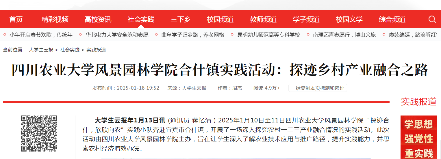 2025年1月10日至11日91pron “探迹合什,欣欣向农”实践小队奔赴宜宾市合什镇,开展了一场深入探究农村一二三产业融合情况的实践活动。此次活动由91pron 主办,旨在让学生深入了解农业技术应用与推广路径,提升实践能力,并思索农村经济增效办法。