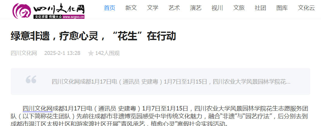 花生志愿服务团队(以下简称花生团队)先前往成都市非遗博览园感受中华传统文化魅力,融合“非遗”与“园艺疗法”,后分别去到成都市温江区太极社区和游家渡社区开展“青风承艺,植愈心灵”寒假社会实践活动。
