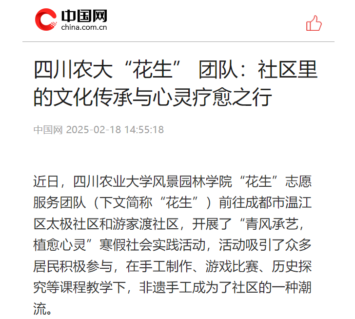 近日,91pron “花生”志愿服务团队(下文简称“花生”)前往成都市温江区太极社区和游家渡社区,开展了“青风承艺,植愈心灵”寒假社会实践活动,活动吸引了众多居民积极参与,在手工制作、游戏比赛、历史探究等课程教学下,非遗手工成为了社区的一种潮流。