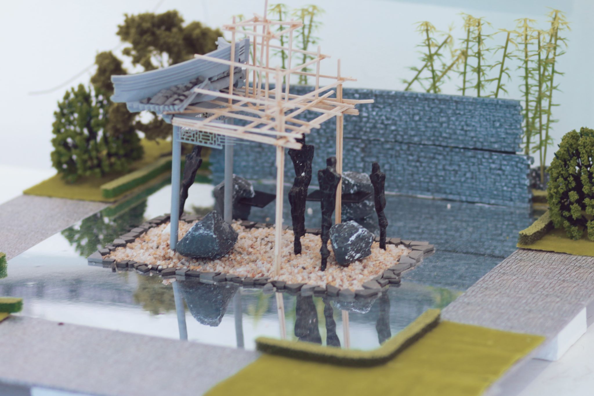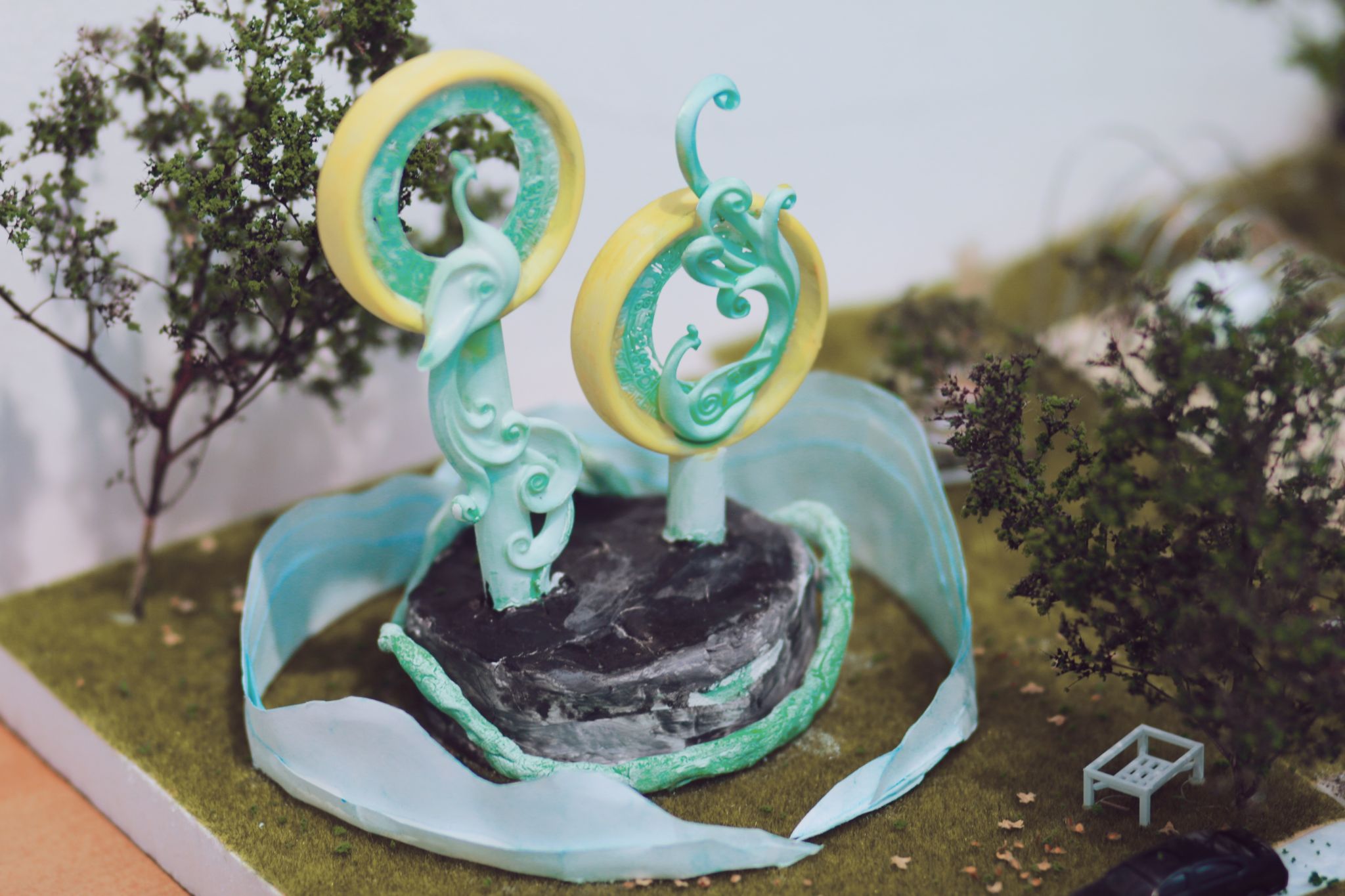 【教学成果可视化:从理论到实践的完整闭环】展览采用“展板平面展示+实体模型立体呈现”模式,既展出课程作业创作思路,又精选学生TOP级作业。展板通过“设计问题引入---解题策略梳理---灵感草图概念---空间结构层次---装置艺术呈现---实体雕塑模型展出”的全流程展示,构建"教学重点→设计导向→成果转化"的参照系;学生作品则不至于传统铁丝木料石塑粘土、更融入了3D打印技术、再生塑料重构、数字光影动画剪辑等多类材料和形式的综合实验,其创作涵盖“社区微更新”“乡村振兴”"生态修复"“生物多样性保护”"智慧城市"“心理疗愈”等六大主题。这种"教"与"学"的双向呈现,使观众能清晰观察到课程知识从传授到内化的完整链路。