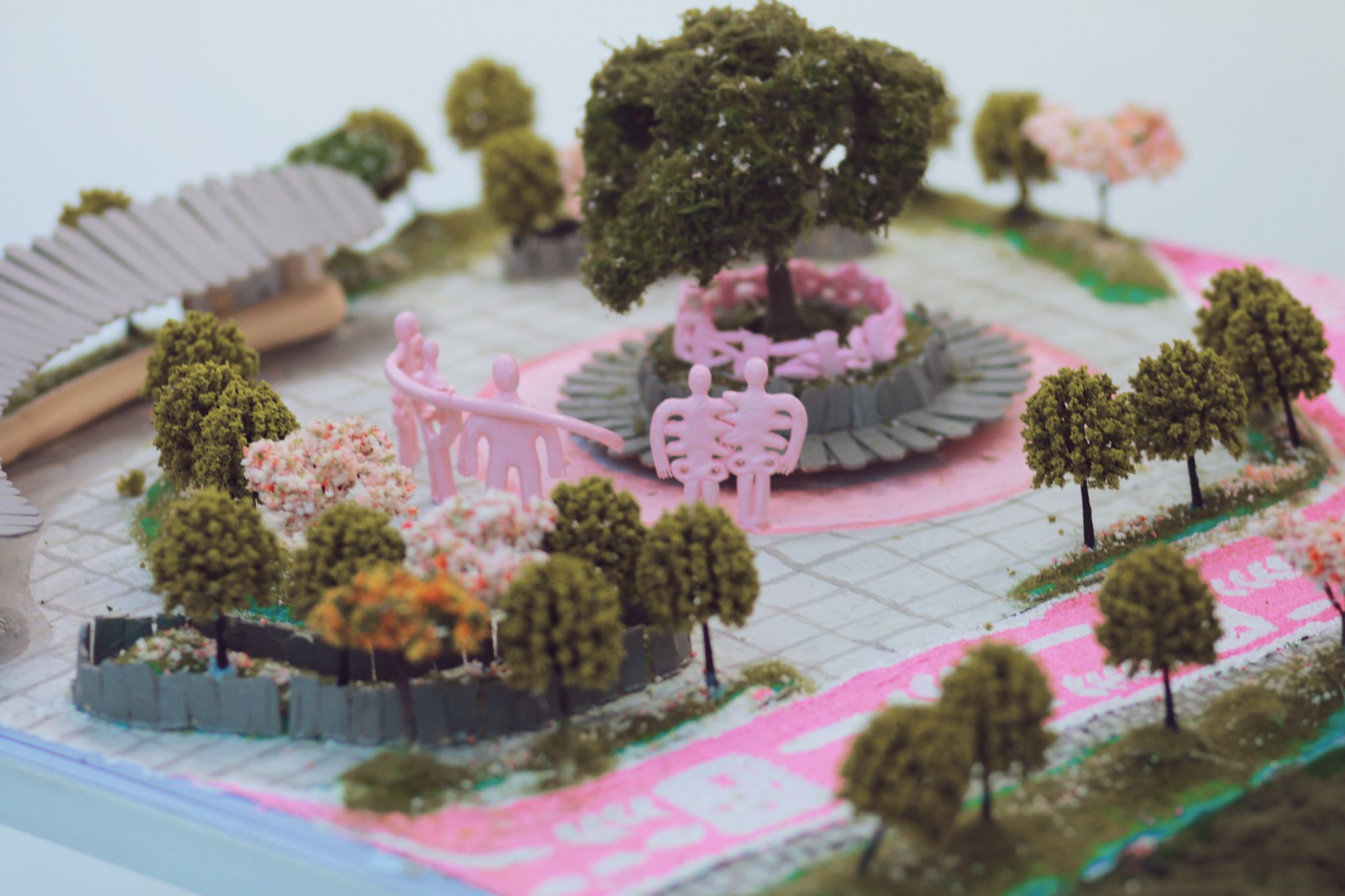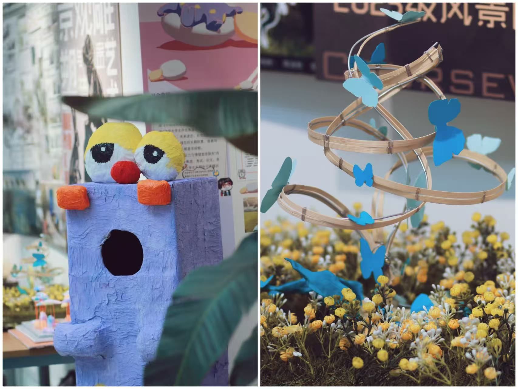 【互动机制激活学习动能】展览除了常规的展板画面展示,还有部分互动装置艺术。现场互动装置如《烦恼吞噬兽》《今天你糊脑了么》等作品,通过观者参与触发装置变化,实现艺术品与参与者情绪的良性互动给人留下深刻印象。展览期间,还特别设置了创作者互动环节,邀请参展学生现场讲解创作理念与制作过程,观众不仅可以近距离欣赏作品,还能与创作者深入交流,感受艺术背后的思考与情感。此外,展览还吸引了非本专业师生对课程的关注与兴趣,他们对设计方向学生作品的创新性和实践意义给予了高度评价,认为这些作品不仅展示了学生的艺术才华,更体现了对社会责任和环境保护的深刻思考。通过此次展览,学生们不仅得到了宝贵的实践机会,也为未来投身于景观设计领域打下了坚实的基础。