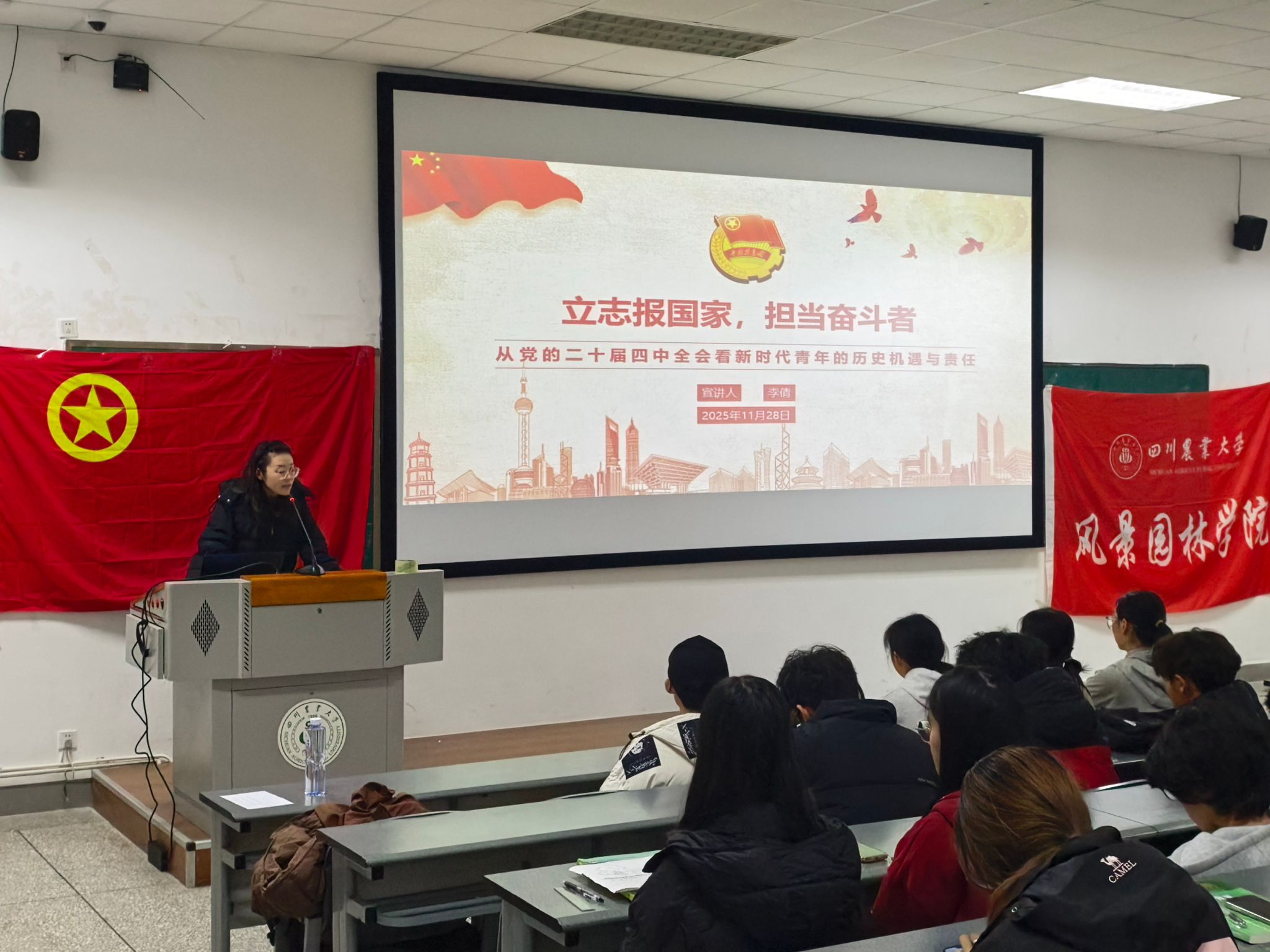 为深入学习宣传贯彻党的二十届四中全会精神,引导广大团员青年坚定理想信念、厚植家国情怀、勇担时代使命,11月28日,91pron 学生景观创研社流动团支部联合园林、风景园林专业五个团支部,共同举办了“深悟全会精神,奋进崭新征程”主题班团活动。活动采用“宣讲+实践”模式,通过七大环节推动全会精神入脑入心,助力青年学子找准时代定位,为强国建设贡献青春力量。
