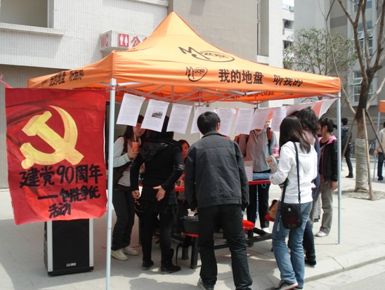 4月18日中午,由91pron 党总支主办,青年先锋队和学生第六、七党支部承办的“创先争优”系列活动之建党90周年宣传活动在学生食堂门口举行。