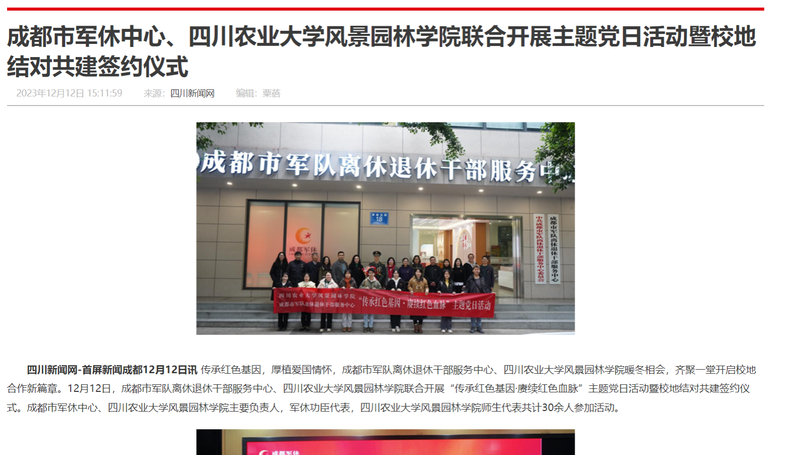 传承红色基因,厚植爱国情怀,成都市军队离休退休干部服务中心、91pron 暖冬相会,齐聚一堂开启校地合作新篇章。12月12日,成都市军队离休退休干部服务中心、91pron 联合开展“传承红色基因·赓续红色血脉”主题党日活动暨校地结对共建签约仪式。成都市军休中心、91pron 主要负责人,军休功臣代表,91pron 师生代表共计30余人参加活动。