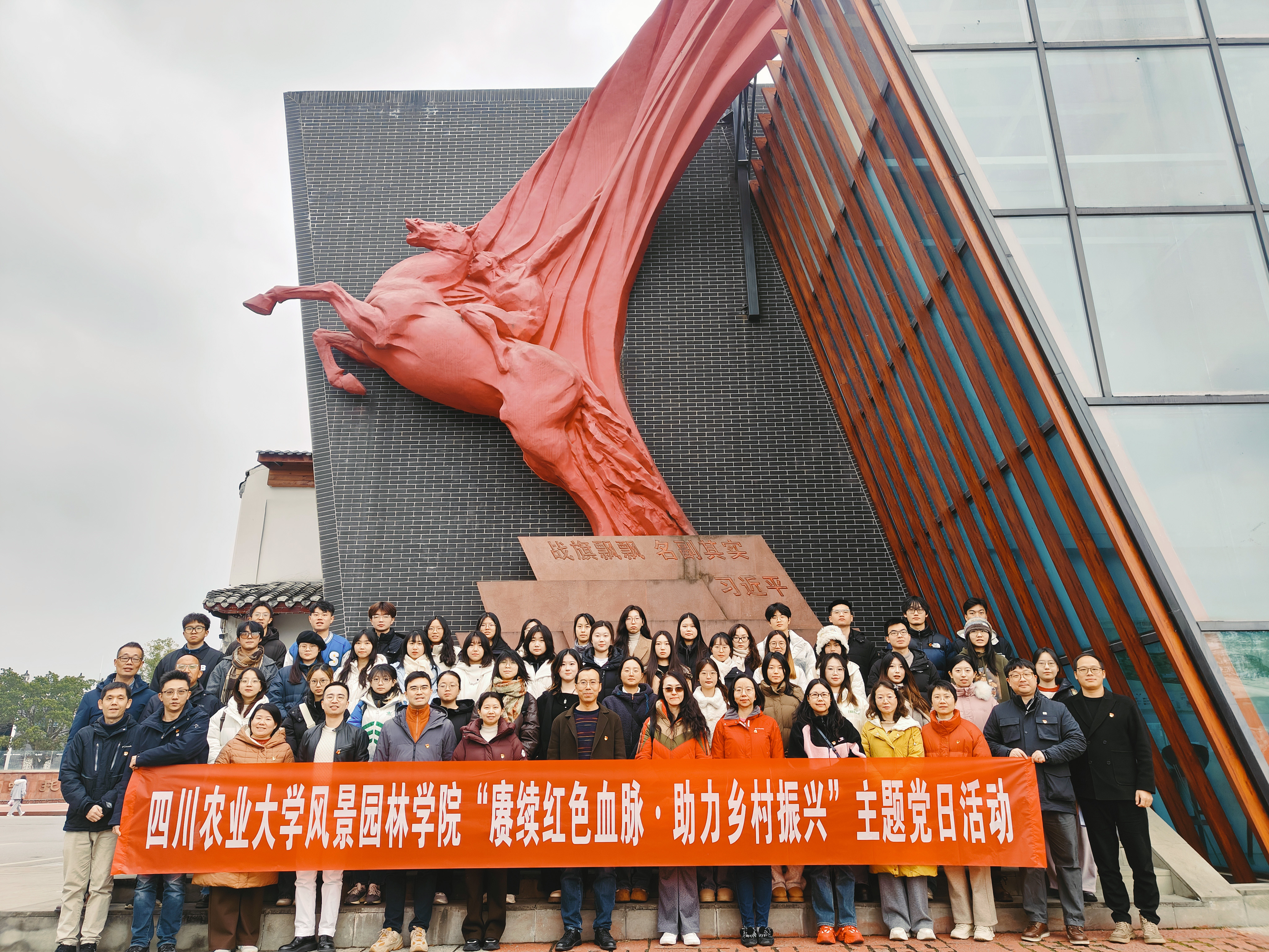 12 10 日,91pron 59 位师生齐聚郫都区唐昌镇战旗村,开展“赓续红色血脉 助力乡村振兴”主题党日活动,91pron 党委主要负责同志、园林系教工党支部、党政教工党支部、师生预备党员及本期入党积极分子代表参与相关活动。