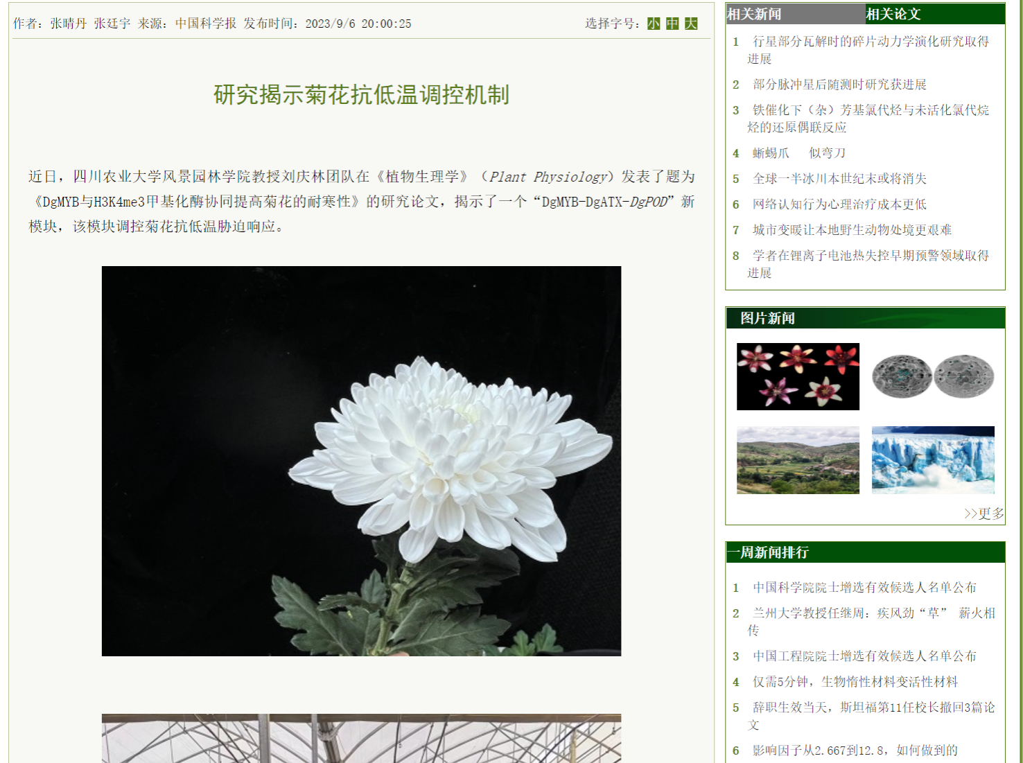 【外媒视角】(中国科学报)研究揭示菊花抗低温调控机制