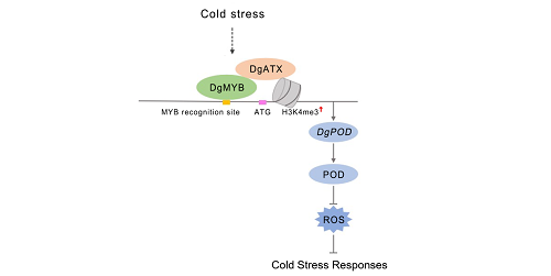 刘庆林团队发现,低温胁迫下DgMYB和DgATX均具有增强菊花低温抗性的能力。进一步研究发现,DgMYB不仅通过识别下游基因DgPOD的特定DNA序列来提高下游基因的表达量,还通过招募DgATX促进组蛋白H3K4me3富集,从而促进DgPOD的转录与表达,提高POD活性,减少ROS积累,进而增强菊花的低温抗性。该研究结果为菊花抗低温分子育种提供基因资源和理论借鉴。
