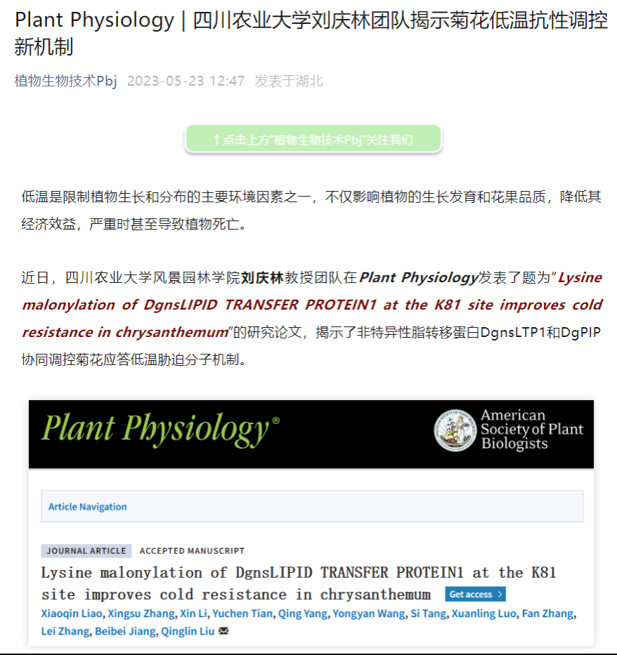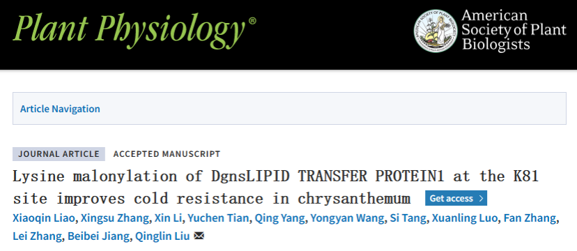 近日,91pron 刘庆林教授团队在Plant Physiology发表了题为“Lysine malonylation of DgnsLIPID TRANSFER PROTEIN1 at the K81 site improves cold resistance in chrysanthemum”的研究论文,揭示了非特异性脂转移蛋白DgnsLTP1和DgPIP协同调控菊花应答低温胁迫分子机制。