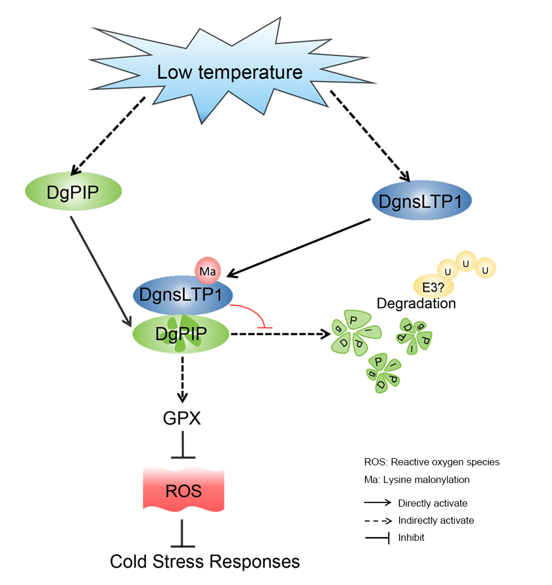 当菊花受到低温胁迫后,DgnsLTP1和DgPIP都能增强菊花的低温耐性。进一步研究发现,DgnsLTP1以依赖于DgPIP的方式发挥作用。DgnsLTP1在K81位点赖氨酸丙二酰化可以增强DgPIP的稳定性,抑制DgPIP的降解,进而增强菊花的低温耐性。该研究结果为菊花抗低温分子育种提供基因资源,同时也对解析赖氨酸丙二酰化在植物响应低温胁迫中的生物学功能提供一定借鉴。