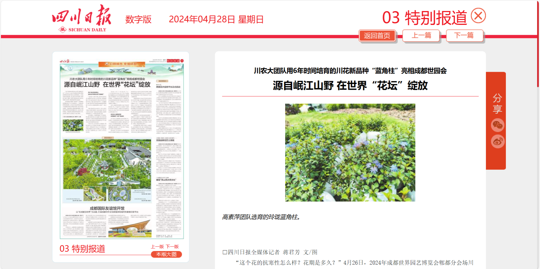 【媒体视角-四川日报】川农大团队用6年时间培育的川花新品种“蓝角柱”亮相成都世园会 源自岷江山野 在世界“花坛”绽放