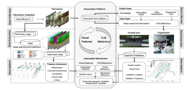 该研究综合运用了全景影像采集、语义分割、机器学习等数智化技术,并依托自主研发的全景漫游平台,对自然性、纪念性、复杂性、视觉尺度和色彩五大维度进行精准测度,实现了游客行为数据与空间特征的点位匹配。结果揭示了水体与纪念性元素在提升游客停留和流动中的关键作用,并指出中轴线纪念性景观在引导游客行为方面具有显著效应。论文提出的“视觉特征—位移行为”一体化分析框架,为古典园林感知设计、遗产保护和游憩管理提供了新路径。