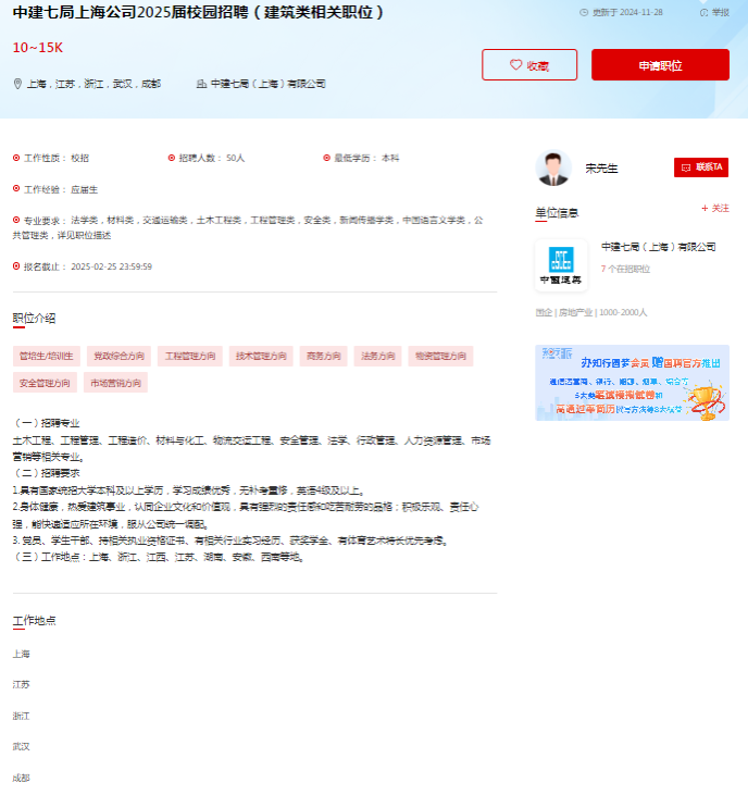 中建七局(上海)有限公司2025届校招(建筑类相关职位)