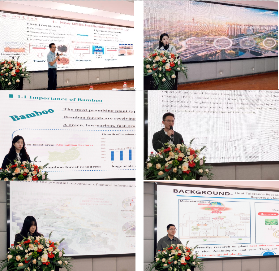 会议学术报告环节,上午场次由环境91pron 院长沈飞教授和雷永佳副教授,以及91pron 副院长蔡军教授和郭丽副教授共同主持。此阶段共有四位国际知名专家和两位青年学者报告了他们的最新研究成果。希腊帕特雷大学Dionissios Mantzavinos教授作了《Biomass Valorization in the Context of Sustainable Engineering and Circular Economy(可持续工程和循环经济背景下的生物质增值)》的线下主旨报告,澳大利亚纽卡斯尔大学Cheng Fang教授作了《Emerging Contamination: Microplastics and Nanoplastics in our Daily Lives(新出现的污染:日常生活中的微塑料和纳米塑料)》的线上主旨报告,美国克莱姆森大学Hong Luo教授作了《Epigenetic Control of Plant Development and Stress Response in Grasses(禾本科植物发育和应激反应的表观遗传控制)》的线下主旨报告,加拿大不列颠哥伦比亚大学Guangyu Wang作了《Forest Therapy and Human Health: Current Status and Prospects(森林疗愈与人类健康:现状与前景)》的线下主旨报告。同时,来自我校的研究生蒋运萌和刘艺分别作了《Effects of Tree Leaf Color on Human Physical and Mental Recovery from a Looking-Up Perspective(从仰视角度看树叶颜色对人类身心康复的影响)》和《Research on New Resistance Gene Engineering Bamboo and Sustainable Development(新型抗性基因工程竹研究与可持续发展)》的青年报告。