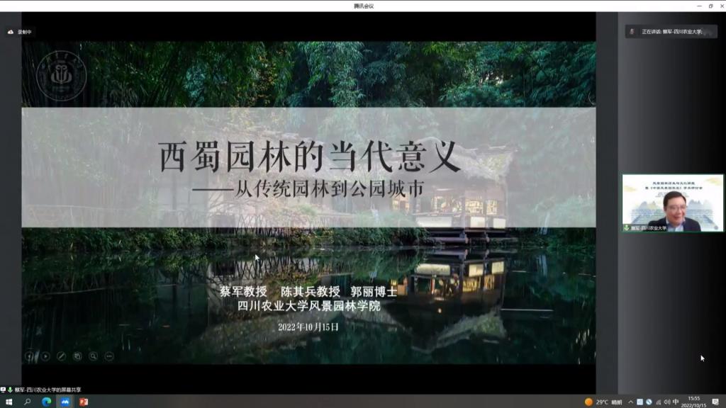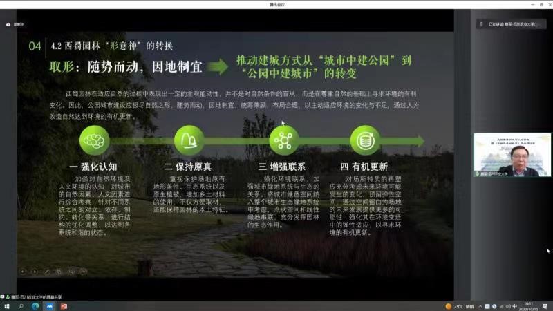 会上,专家学者分别就北方、江南、岭南、西北和西南五个地区编写的重要风景园林历史文化研究展开学术讨论。蔡军以“西蜀园林的当代意义——从传统园林到公园城市”为主题,从西蜀园林的发展历史及研究概况、西蜀园林与公园城市建设的渊源、西蜀园林对于公园城市建设的启发、西蜀园林之于公园城市的实践四个方面做了主题报告。